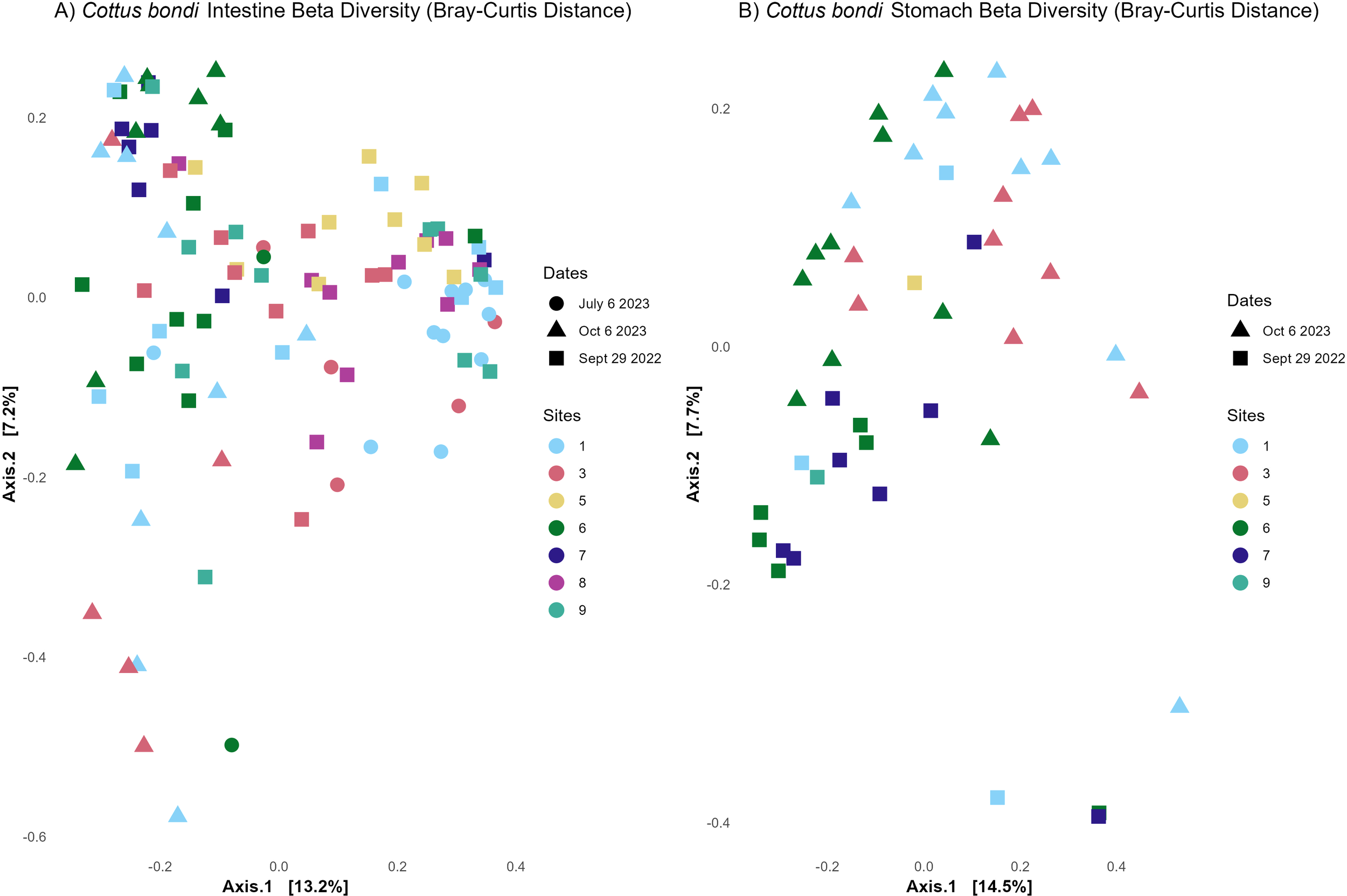 Beta diversity from microbial communities in the intestines and stomachs of Rocky Mountain Sculpin (Cottus bondi) collected at one site upstream the WWTP (Site 1) and multiple sites downstream the WWTP (sites 3-9) at East Gallatin River during the fall of 2022 and summer and fall of 2023. (A) Bray-Curtis distances for sculpin’s intestine showing significant differences in microbial community composition between sites (p=0.001, PERMANOVA) and dates (p=0.001, PERMANOVA) (B) Bray-Curtis distances for C. bondi stomachs showing significant differences in microbial community composition between sites (p=0.002, PERMANOVA) and dates (p=0.008, PERMANOVA).