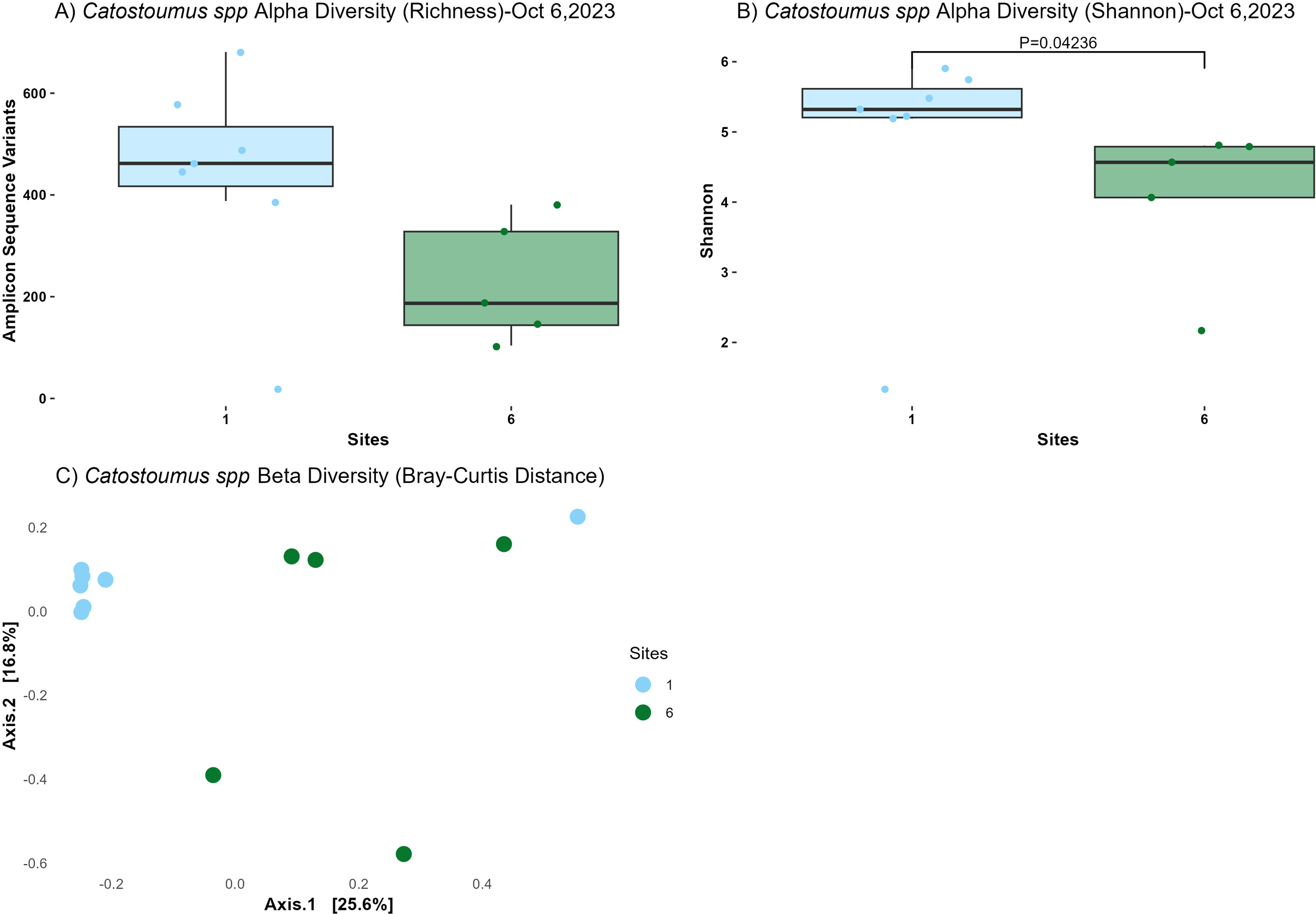 Alpha and beta diversity metrics from microbial communities in the intestines of suckerfish (Catostomus spp) collected at one site upstream the WWTP (Site 1) and one site downstream the WWTP (Site 6) at the East Gallatin River on Oct 6th, 2023. (A) Observed Amplicon Sequence Variants (ASVs). No significant difference was detected between sites 1 and 6 (p= 0.07313, ANOVA). (B) Shannon diversity index for Castostomidae spp. intestines showing significant differences (p=0.04236, Kruskal-Wallis). (C) Bray-Curtis distances for Castostomidae spp. intestines showing significant differences in microbial community composition between sites (p=0.017, PERMANOVA). Both Catostomus species are pooled for more statistical power in this analysis.