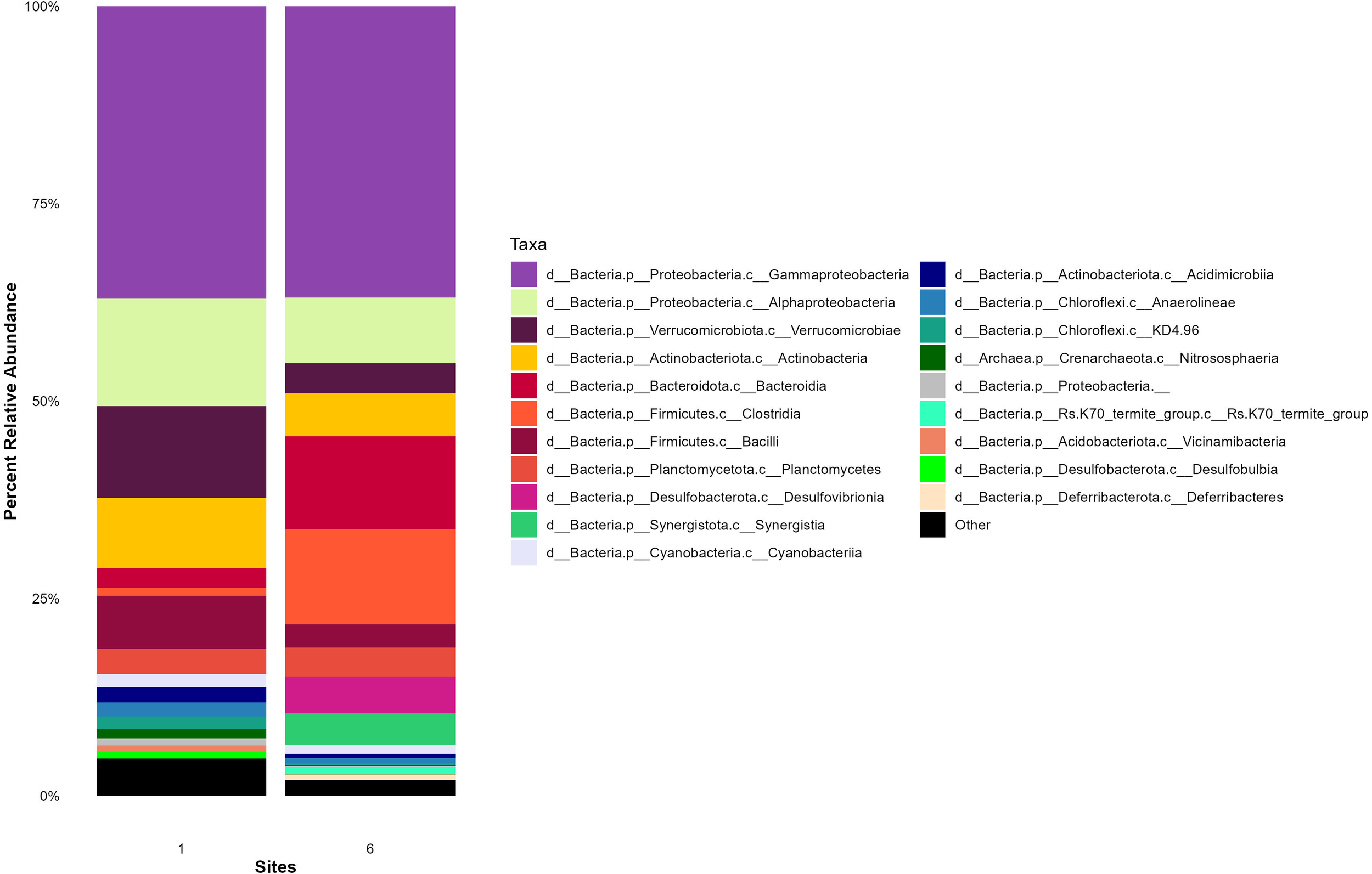 When comparing the microbial communities between Site 1 and Site 6, the overall structure remained relatively stable, with the same dominant classes present at both sites. However, there were differences in the relative abundance of these classes, particularly Alphaproteobacteria, Verrucomicrobiae and Actinobacteria, which were more prevalent at the upstream Site 1.