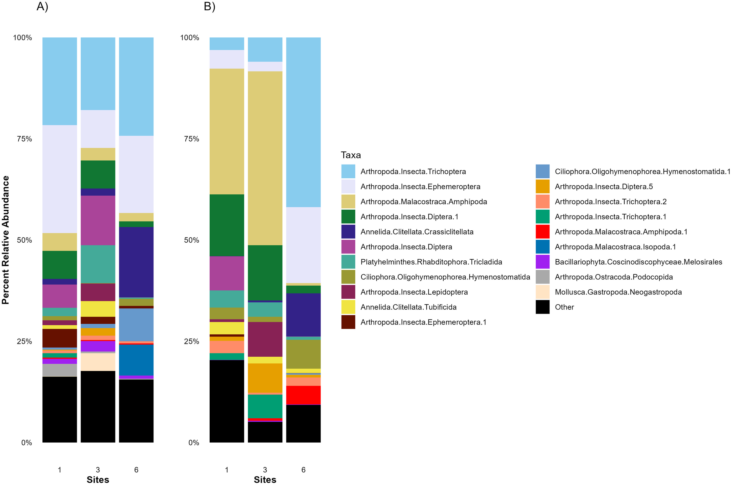 Average 16S relative abundances of the top 20 taxa in the intestines and stomachs of Rocky Mountain Sculpin (Cottus bondi) collected at one site upstream the WWTP (Site 1) and two sites downstream the WWTP (Sites 3 and 6) at the East Gallatin River on Sept 29, 2022, July 6 and Oct 6, 2023. The stacked bar chart illustrates the average 16S relative abundances of the top 20 taxa in the (A) intestines and (B) stomachs of C. bondi at each site. Each bar represents a site, with different colors indicating the average relative abundance of various microbial classes.