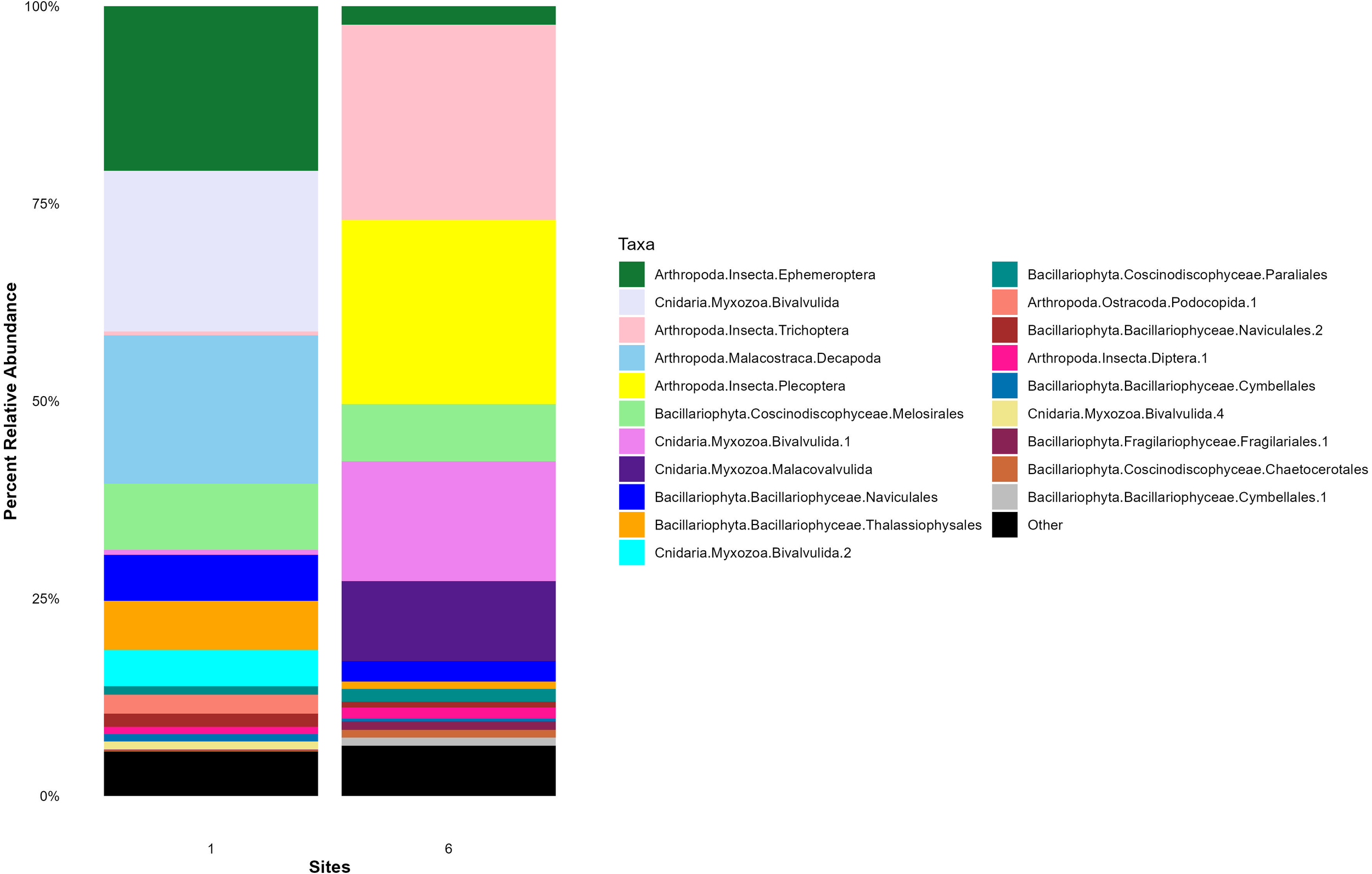 Average 16S relative abundances of the top 20 taxa in the intestines of suckerfish (Catostomus spp) collected at one site upstream the WWTP (Site 1) and one site downstream the WWTP (Site 6) at the East Gallatin River on July 6 and Oct 6, 2023. The stacked bar chart illustrates the average 16S relative abundances of the top 20 taxa in the intestines of Catostomus spp. at each site. Each bar represents a site, with different colors indicating the average relative abundance of various microbial groups. Both Catostomus species are pooled for more statistical power in this analysis.