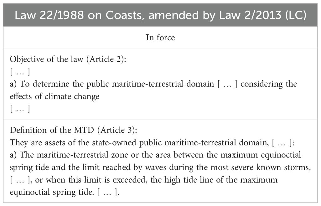 In Spain, the legal framework governing the use and protection of coastal zones has undergone several changes in recent years. The current regulations are primarily established by Law 22/1988 on Coasts (Government of Spain, 1988), as amended by Law 2/2013 (Government of Spain, 2013; hereinafter LC), and further developed in the Regulation enacted through Royal Decree 876/2014 (Government of Spain, 2014; hereinafter RGV). Although this regulation has remained in force since its publication, it was temporarily modified by Royal Decree 668/2022 (Government of Spain, 2022; RGF), which introduced amendments to several critical articles. However, these modifications were annulled by the Supreme Court ruling of January 31, 2024.