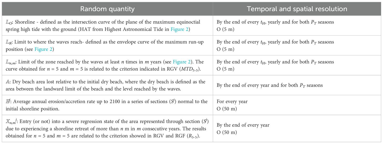 Based on the stored information and the legal framework outlined in the Introduction section, several random variables are defined to facilitate the decision-making process of the Andalusian administration responsible for authorizations and concessions for the use and/or occupation of land in the public maritime-terrestrial domain and the coastal protection easement area (Table 3). The characterization of these variables using statistical techniques allows for the association of probabilities of occurrence to different events related to erosion and flooding in the future, at various time horizons (tH) particularly at those corresponding to the years 2030, 2035, 2050, 2100. These dates represent the timeframes that managers must consider making decisions in accordance with the law. This approach avoids the use of historical recorded data, aiming to harmonize the definitions of the curves given in the legal texts with the mandate to consider CC effects, while introducing a time frame (tH) that can be chosen depending on the characteristics of the coastal management problem under consideration. Additionally, to facilitate decisions regarding the authorizations for the occupation of the MTD for seasonal services, two seasonal periods corresponding to peak (PS) and off-peak (OS) tourist seasons were considered, in addition to the yearly scale. These periods range from April 1st to September 30th for PS and from October 1st to March 31st for OS. Table 2 summarizes the random sets that are analyzed, including the type of statistical information computed and their spatial and temporal resolution. Figure 2 sketches the definition of some of these quantities.