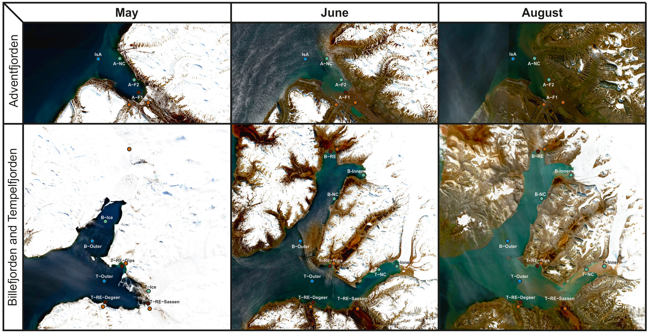 Satellite images of Adventfjorden, Billefjorden, and Tempelfjorden, derived from Sentinel Hub by Sinergise (https://dataspace.copernicus.eu/), showing the sampling locations, sea-ice coverage, and surface riverine and glacial runoff during each sampling period. Stations in the main basin (MB: IsG, IsK, ME-3), located outside the image frames, were visited in each month. Cloud-free images were selected as close as possible to the sampling dates, which are indicated in the captions as follows: satellite image from May 14 corresponding to the May 10–11 sampling; June 22 for the June 18–24 sampling; and August 6 for the August 16–24 sampling, except for Billefjorden in May, where the image corresponds to May 18 – the nearest date with minimal cloud cover over the fjord.