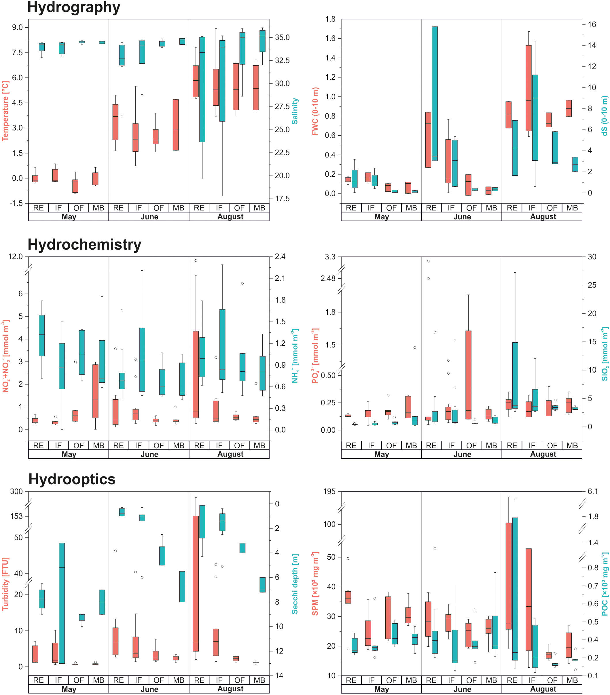 In August, a 2–3 °C rise in air and water temperatures intensified glacial melt and coastal runoff, delivering high loads of SPM and POC to nearshore areas (Figure 3). This formed turbid freshwater plumes that reduced water clarity, as indicated by lower SD, with their influence decreasing offshore. As a result, a clear salinity and turbidity gradient developed along Isfjorden – from fresh, DIN- and SiO2-rich inner waters in RE and IF to more saline, clearer conditions in OF and MB. At the same time, advected AW occupied the deeper layers of MB (Figure 4).