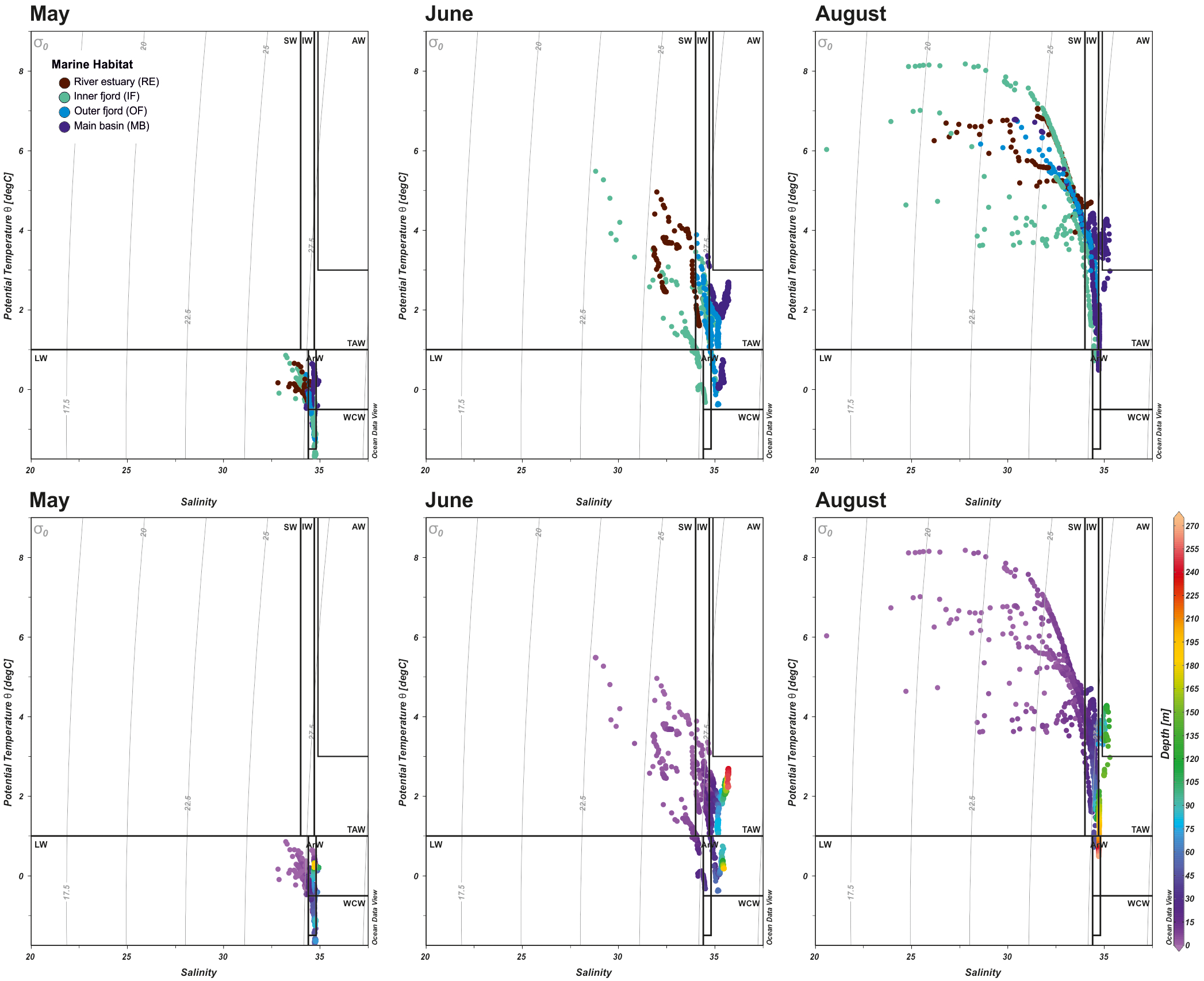 Temperature–salinity (TS) diagrams derived from monthly CTD profiles, presented by habitat (upper panels) and by depth (lower panels). Water masses were classified according to categories specific to Isfjorden, as defined by Nilsen et al. (2008).