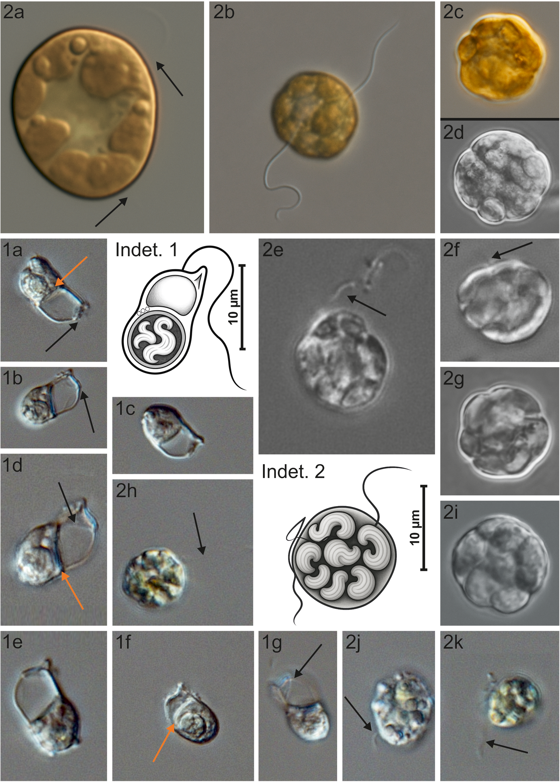 Illustrations of two unidentified protists commonly observed across the European Arctic: “Indeterminate 1” (1a–g) and “Indeterminate 2” (2a–k). Images were acquired using Z-stack imaging (Nikon) at 400× and 600× magnifications. Scale bars are shown only in schematic drawings. Black arrows indicate flagella, which are barely visible under light microscopy; their absence in some cells may result from subapical insertion or loss during fixation. Orange arrows mark structures resembling ejectosomes, known from some heterotrophic protists; they are also shown schematically in the drawing, though their number and arrangement may vary between cells. “Indeterminate 2” (a–i) was imaged in 2019; (j–k) in 2025 during follow-up analyses. Differences between the image sets suggest that “Indeterminate 2” is prone to morphological alteration during long-term storage, a pattern not observed in “Indeterminate 1”.