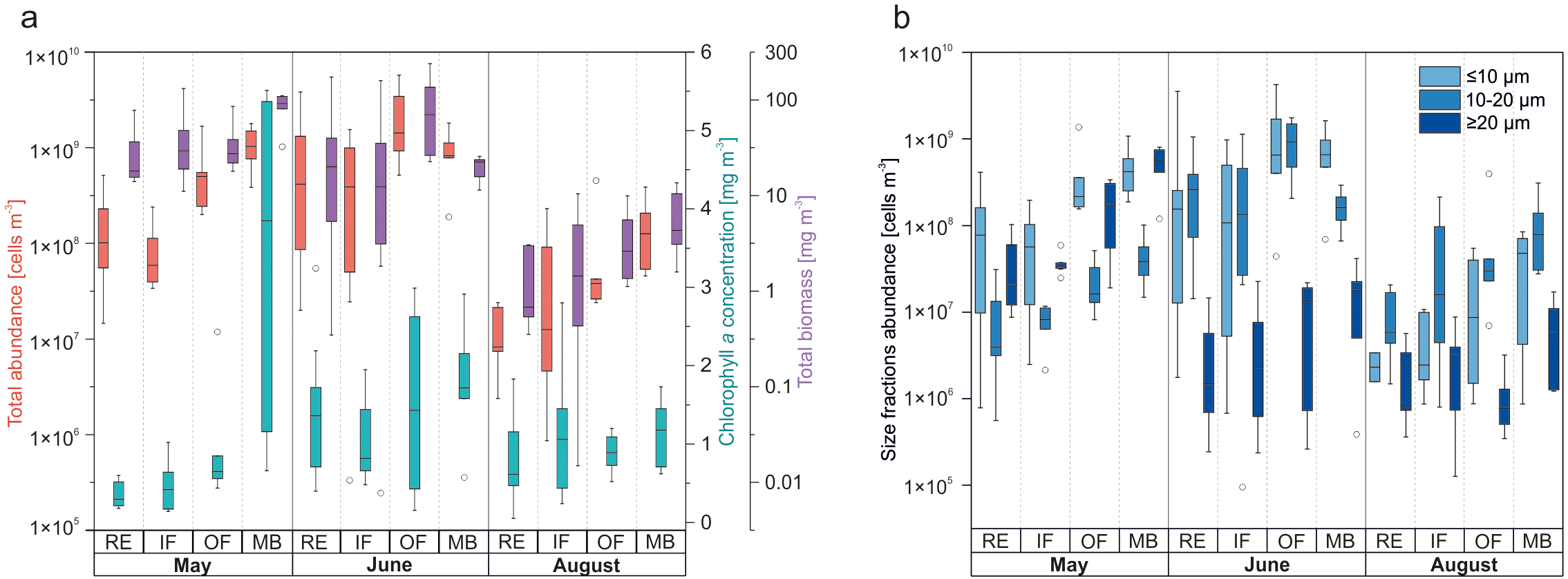 Protistan abundance and size structure exhibited substantial spatial and temporal variability throughout the study period (Figure 6). Seasonal patterns in total abundance closely mirrored biomass trends, which, in turn, corresponded well with variations in chlorophyll a concentrations – a proxy for primary producer biomass. Notably, these patterns differed markedly between the inner fjord areas (RE, IF) and the outer regions (OF, MB).
