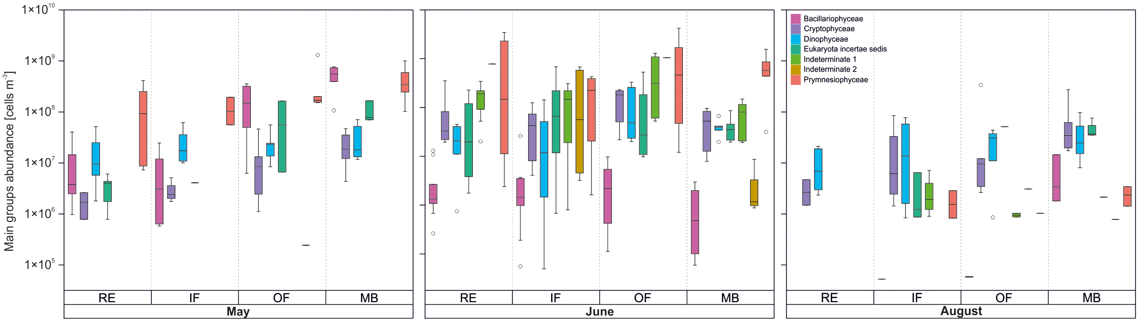 A limited number of protist groups, hereafter referred to as the main groups, accounted for the majority of the community composition, each contributing at least 5% to the total abundance (Figure 7). These dominant groups included Bacillariophyceae, Cryptophyceae, Dinophyceae, Eukaryota incertae sedis (non-identified mono- and biflagellates, predominantly 3–7 µm in size), “Indeterminate 1”, “Indeterminate 2”, and Prymnesiophyceae. Collectively, these groups represented over 97% of total protist abundance.