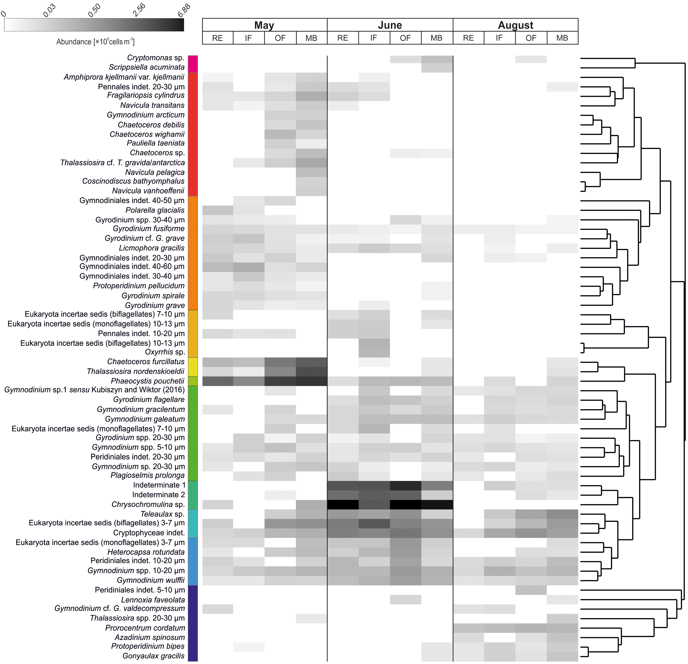 Seasonal associations of protist taxa were illustrated using a heatmap, showing the contributions of taxa (representing >0.01% of total abundance) to overall community composition (cells m-3). Community groupings were further examined using Similarity Profile (SIMPROF) tests and hierarchical clustering of taxa based on Bray-Curtis dissimilarity.