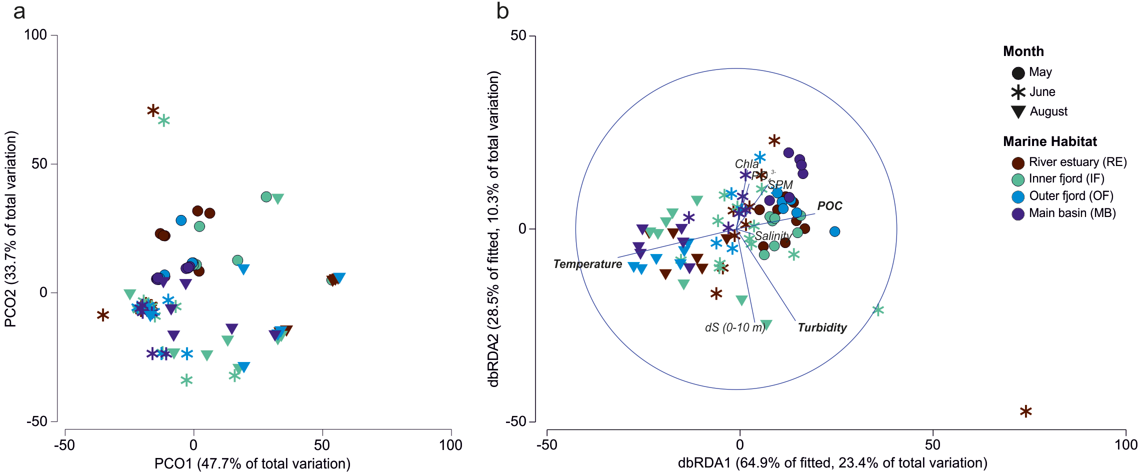 Alpha diversity exhibited clear seasonal and spatial variability (Supplementary Figure 1). Species richness (N0) peaked in May, particularly at the outer stations (MB, OF), while nearshore river-influenced sites (RE) consistently displayed the lowest N0 values across all months, with a general increasing trend toward the main basin. Diversity indices N1 (expected number of equally common taxa) and N2 (expected number of equally abundant taxa) showed broadly similar patterns, both reaching notably higher values in June when comparing habitats across months. Across all months, N1 and N2 values generally increased along the gradient from the innermost fjord regions toward the open waters. An exception to this trend was observed in the IF stations during May and June, where both the median and variability of the diversity indices were substantially higher than in adjacent habitats. In May, the N2/N1 ratio – an indicator of community evenness – suggested greater equitability in less terrestrially influenced locations (MB, OF). By contrast, in June and August, the N2/N1 ratio revealed the highest evenness in nearshore habitats, particularly within the inner fjords (IF), with increasing dominance (lower evenness) observed toward the outer fjord areas (OF, MB).