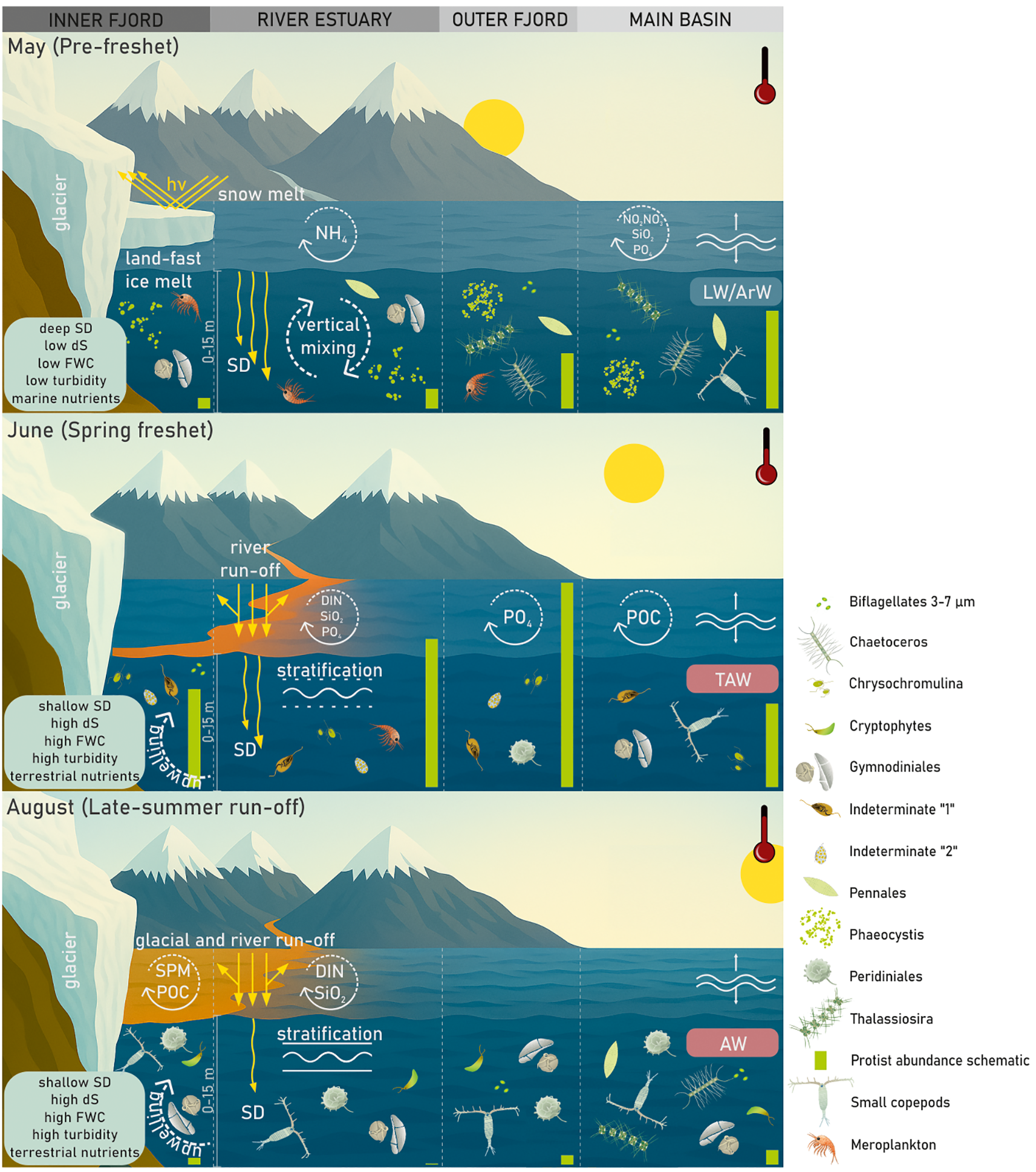 This study aims to clarify how protist communities (here and throughout referring specifically to nano- and microplankton) respond to seasonal, meltwater-driven gradients in freshening, turbidity, and light availability-factors expected to intensify under future climate scenarios. We investigated protistan plankton communities in Isfjorden during three key stages of the 2018 melt season: pre-freshet (May), spring freshet (June), and late summer runoff (August) – a year marked by anomalously warm temperatures and reduced sea ice extent (Osborne et al., 2018). Specifically, we examined:
