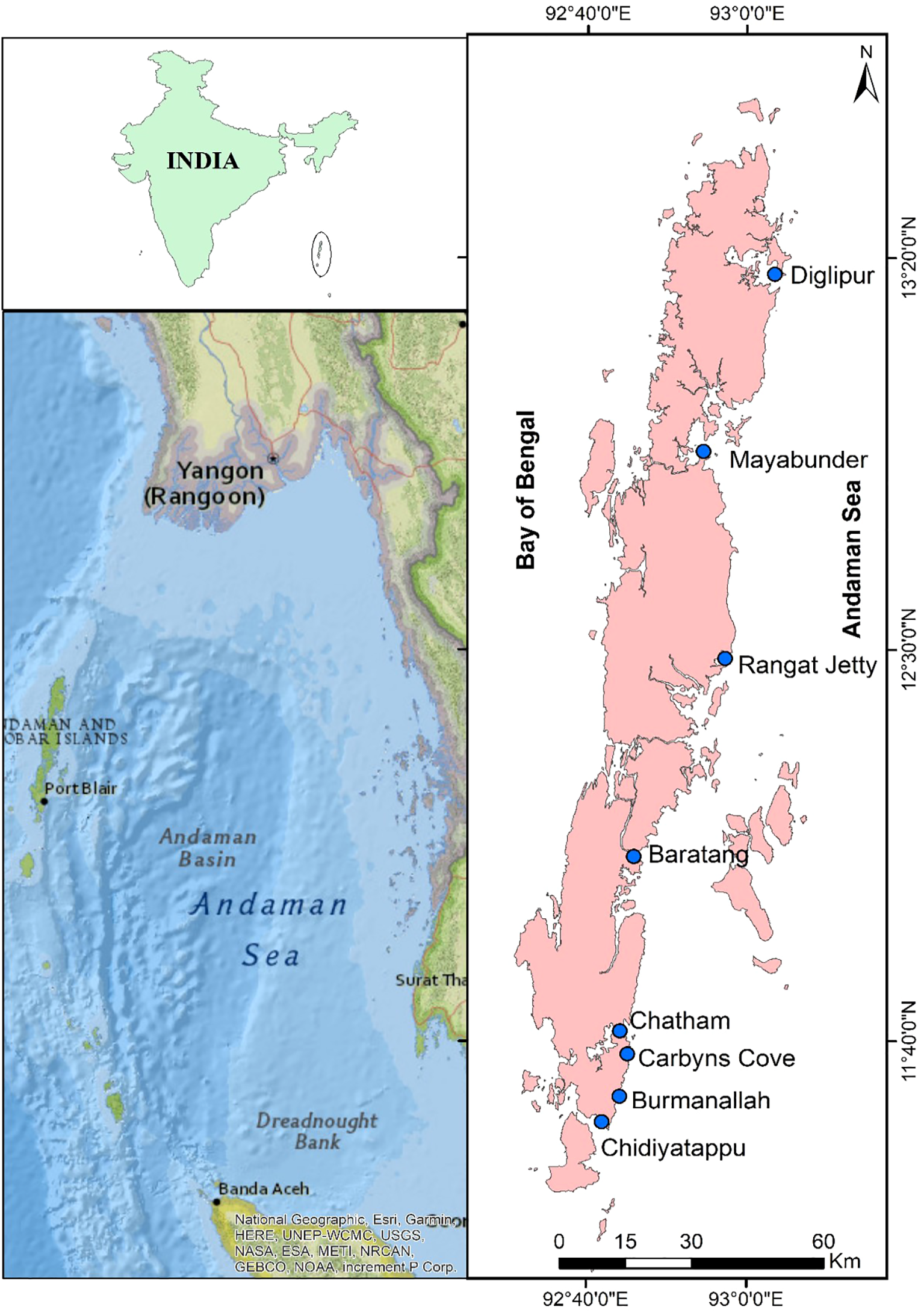 The Andaman Sea (AS), located in the northeastern Indian Ocean and bordered by Myanmar, Thailand, and Malaysia, is a semi-enclosed basin that exchanges water dynamically with the Bay of Bengal (BoB) through the Preparis, Ten Degree, and Great Channels (Sachithanandam et al., 2013, 2022). Seasonal inflow and outflow between the BoB and AS regulate the water column structure and properties (Kiran, 2017; Liao et al., 2020; Sachithanandam et al., 2022). The region receives substantial precipitation during the South Asian monsoon seasons, along with freshwater discharge from the Irrawaddy and Salween Rivers, which lowers surface salinity and contributes to the formation of a barrier layer (Sprintall and Tomczak, 1992; Varkey et al., 1996). The BoB hosts one of the most extensive oxygen minimum zones (OMZs) in the tropics, primarily due to the decomposition of organic matter and the microbial consumption of dissolved organic matter (DOM), processes further intensified by the barrier layer (Paulmier and Ruiz-Pino, 2009). Despite the ecological importance of this region, research on DOC and POC dynamics in the Andaman Sea remains limited compared to the more extensively studied coastal waters of the BoB (Sachithanandam et al., 2022). This study aims to examine seasonal changes in the characteristics of organic carbon in the nearshore coastal waters of the Andaman and Nicobar Islands (ANI). Particular focus is given to the influence of terrestrial inputs from the northern BoB and the role of coral reefs in the ANI. The study further seeks to provide baseline information and improve the understanding of carbon biogeochemistry in this ecologically sensitive tropical island system.