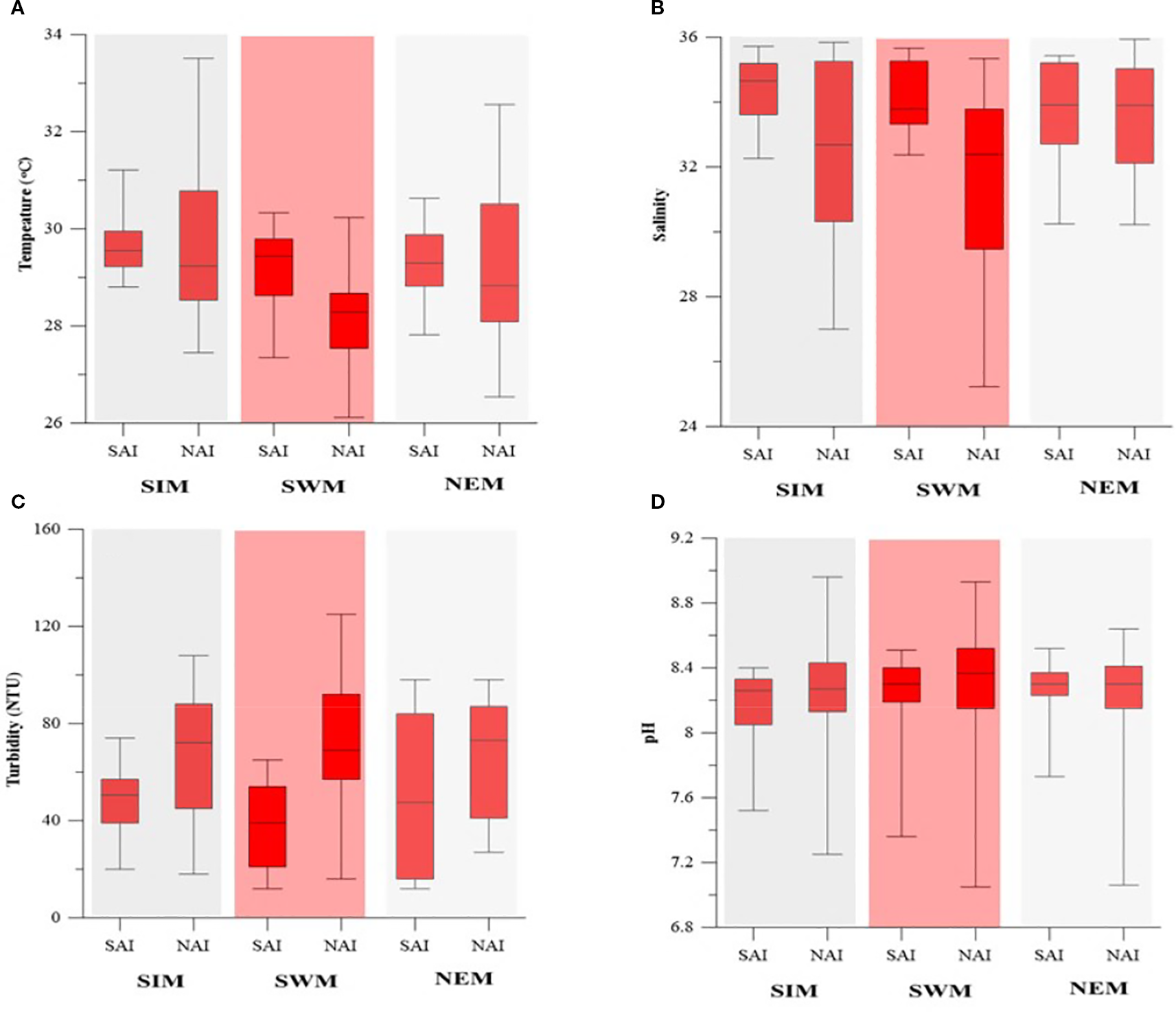 Seasonal variability of (A) Temperature., (B) Salinity, (C) Turbidity and (D) pH in SAI and NAI.