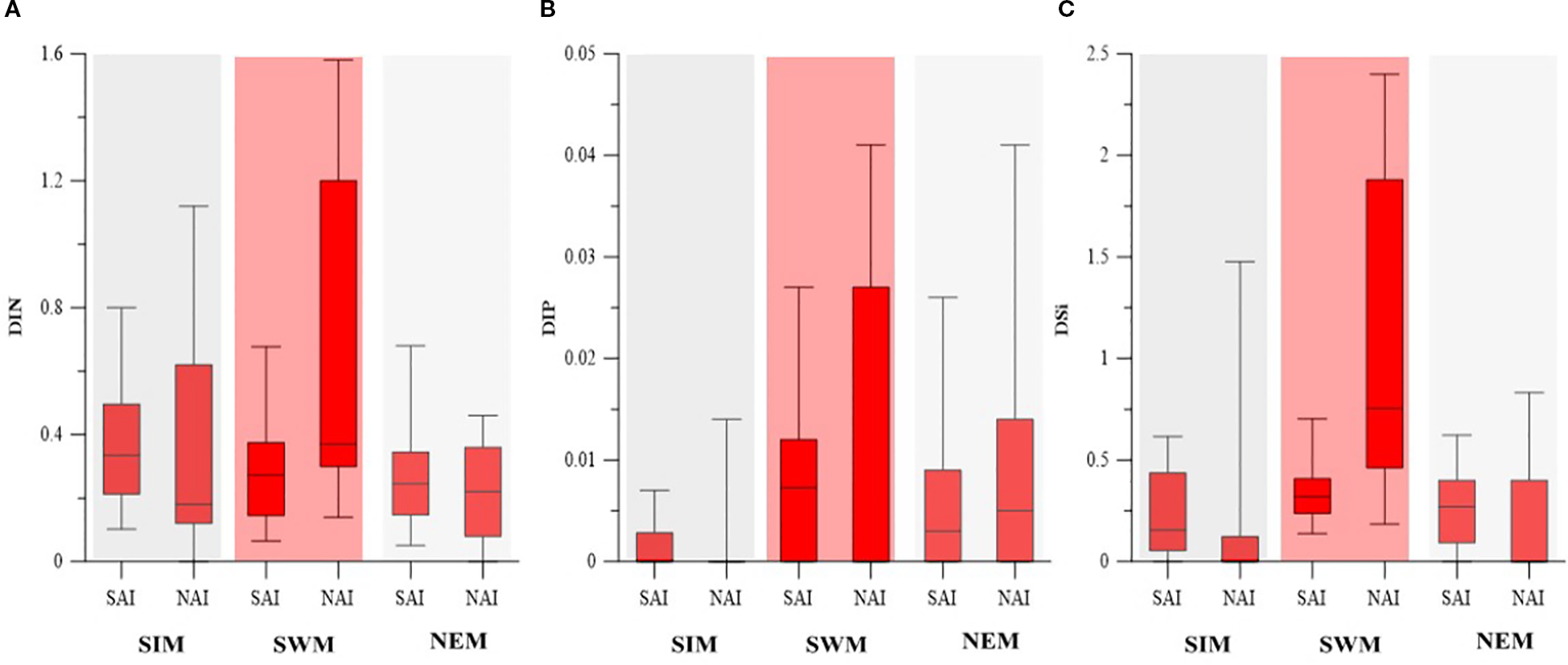 Seasonal variability of (A) DIN., (B) DIP, and (C) DSi in SAI and NAI.