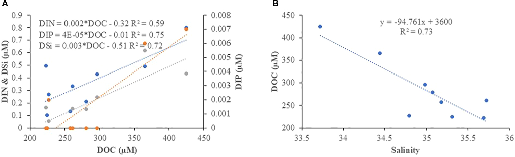 Correlation between DOC and (A) Nutrients (DIN, DIP and DSi) (B) Salinity in the SAI during SIM and SWM respectively.