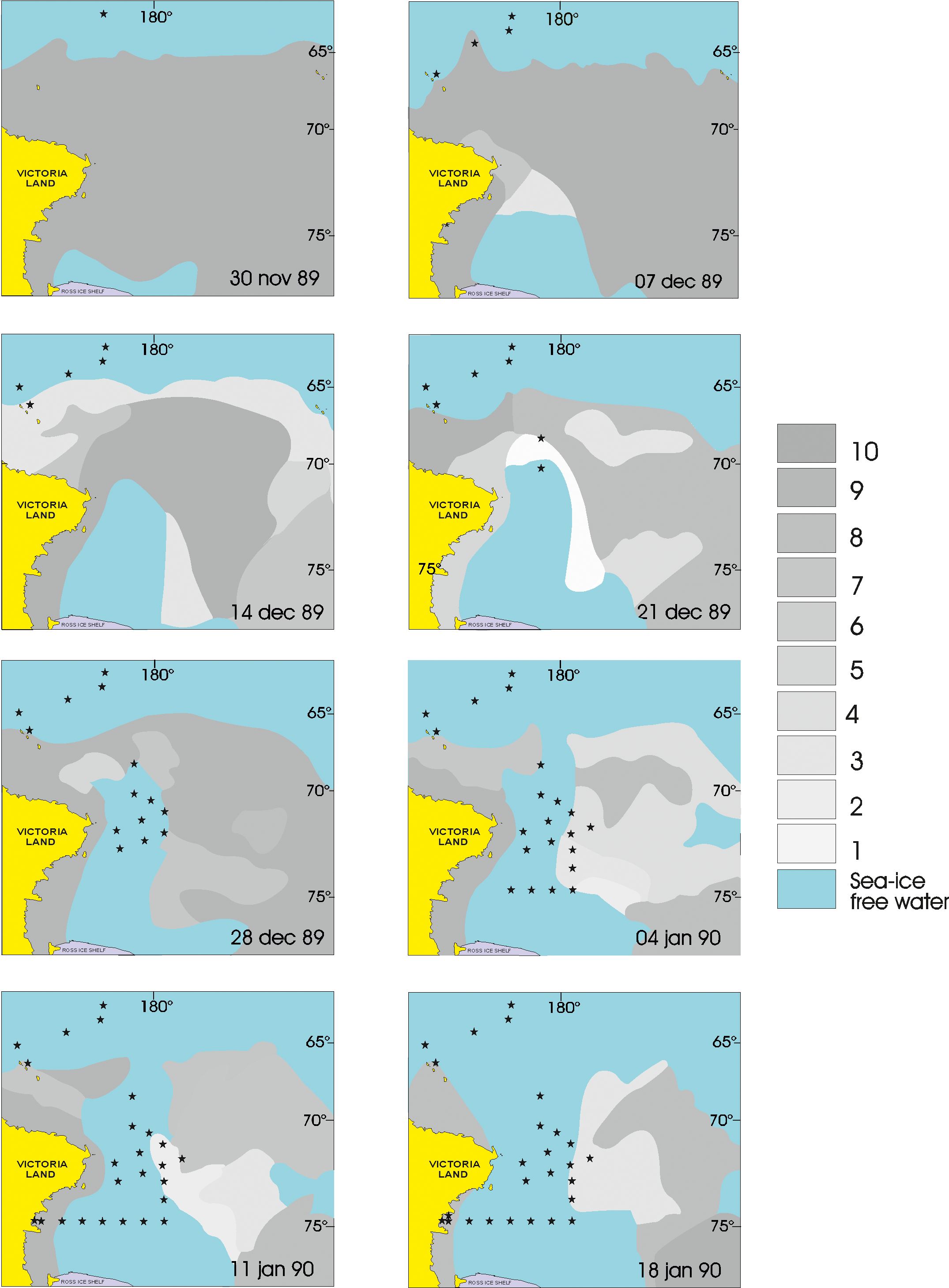 Figure 1. Temporal evolution of ice cover in the southern part of the studied area during the cruise period (from Hecq et al., 2000, modified). The shade of gray represents sea surface ice cover in tenths. Data are taken from satellite images published weekly by NAVY-NOAA Joint ICE Center. Stars represent the location of the BIONESS stations until the date of the image.