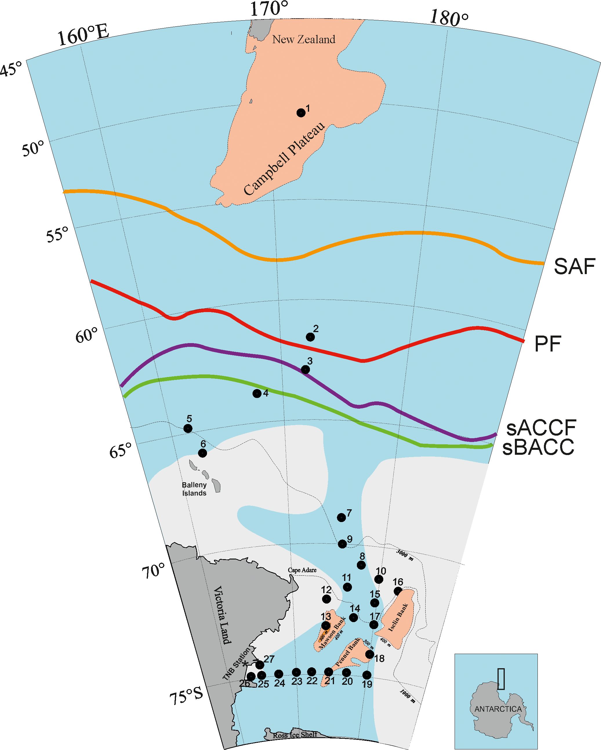 To characterize sea-ice variability within the study area during the cruise period, monthly percent sea-ice concentration maps, derived from satellite observations (www.nsidc.org), were examined for the two months prior to the winter surveys, then during and up to one month after completion of the survey (Figure 1). Due to the very bad meteo-oceanographic conditions that were encountered between stations 1 and 2, and the very extensive ice cover between latitudes 65°S and 70°S, the sheduled distribution of the stations was changed to accommodate the conditions. The zone near the Sub-Antarctic Front (SAF), south of New Zealand, included only station 1, located at 50.9222°S and 172.0011°E (Figure 2), while stations 2–4 were located in the Polar Front (PF) free ice area, north (station 2) and south (stations 3 and 4) of the Antarctic Convergence (AC). South of the AC, stations 5 and 6 were located near the Balleny Islands in an area nearly continuously covered by pack-ice and the presence of icebergs, (e.g. station 7, which was NE of Cape Adare). The oceanic zone, which was covered with drifting ice between 66°S and 70°S, included stations 8 and 9. The pack-ice-free zone between 71° and 73°S included the northern stations 10–12 and the southern transects (stations 13-16), which cut transversely through the Scott Canyon that separates the Mawson Bank from the Iselin Bank, and connects the Ross Sea with the ocean. Stations 17–19 represented a north-south transect, from the Campbell Plateau to the Ross Sea shelf, thus including the area before the Convergence, the Antarctic Convergence and Divergence and the Continental Slope. Stations 19–25 represented a transverse transect that cut the Ross Sea from east to west, along the latitude of 75°S.
