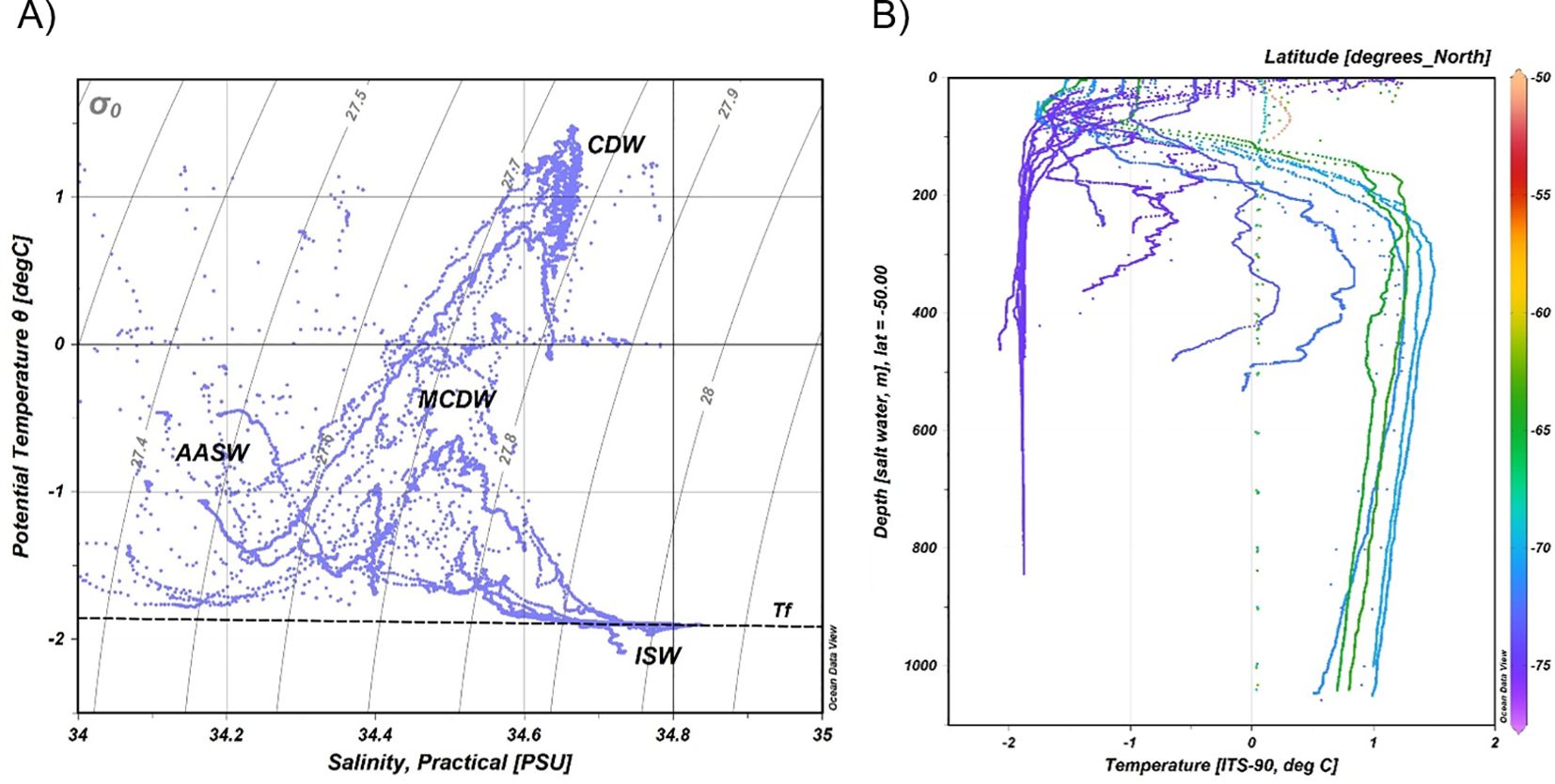 Figure 3. (A) θ/S characteristics from the 27 hydrological stations. The diagram is supplemented by isopycnals (σ0) and freezing temperature (Tf) relative to sea surface pressure. The dashed line indicates the surface freezing point (Tf). The main water masses are labelled with ISW (Ice Shelf Water), MCDW (Modified Circumpolar Deep Water), AASW (Antarctic surface water) and CDW (Circumpolar Deep Water). (B) Temperature profiles of the 27 hydrological stations; the color of each profile is linked to the latitude of each station.