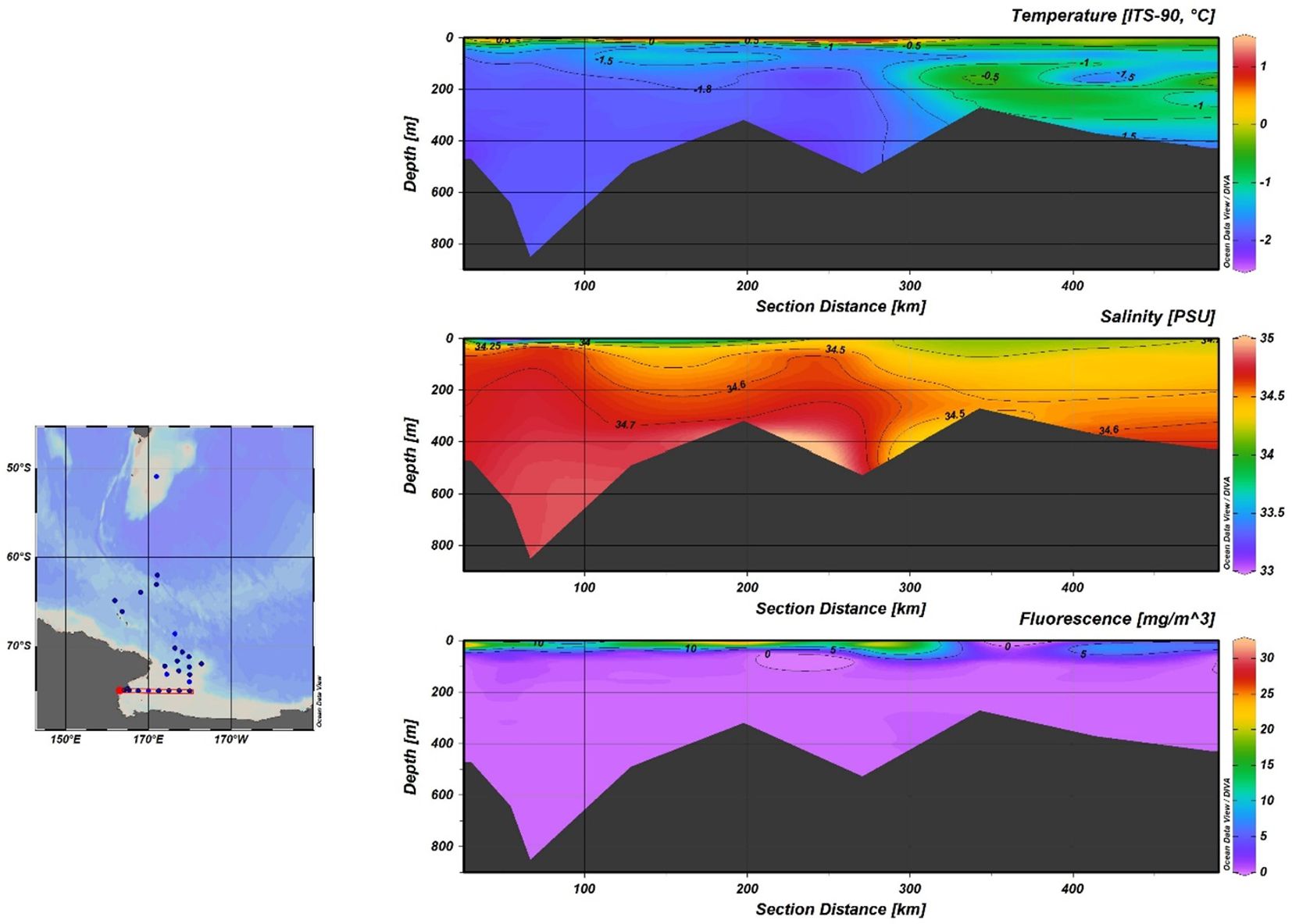 Fluorescence profiles show the presence of DCM (Deep Chlorophyll Maxima) at depths between 10 m and 28 m. The comparison of chlorophyll values (as a proxy of primary production), recorded in the S-N (Figure 4) and W-E (Figure 5) sections, shows that the innermost area of the Ross Sea is characterized by higher productivity.