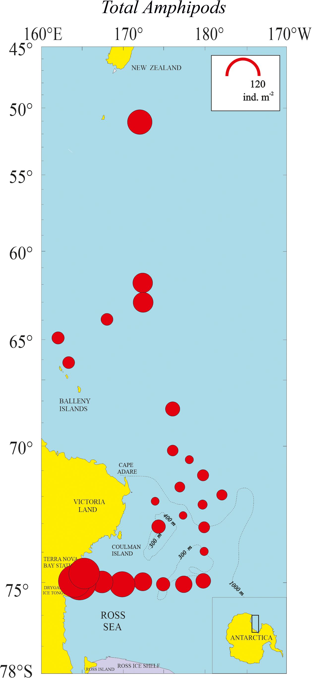 Amphipods were observed at all sampling stations, though not in every sample from each station. The horizontal distribution of total amphipod abundance across the 27 stations is shown in Figure 6. Highest abundance (119.4 ind. m-2) was observed at station 25 within Terra Nova Bay and the lowest (6.73 ind. m-2) at station 14. A high abundance was also observed at station 1 at the Sub-Antarctic sampling site south of New Zealand. Amphipods were particularly abundant in the Polar Frontal Zone, both at station 2, north of the Antarctic Convergence (six identified species and four genera of unidentified species) and at the southern station 3 (seven identified species and three genera of unidentified species). The lowest amphipod richness (three species) was found at stations 12 and 18 (Figure 7).