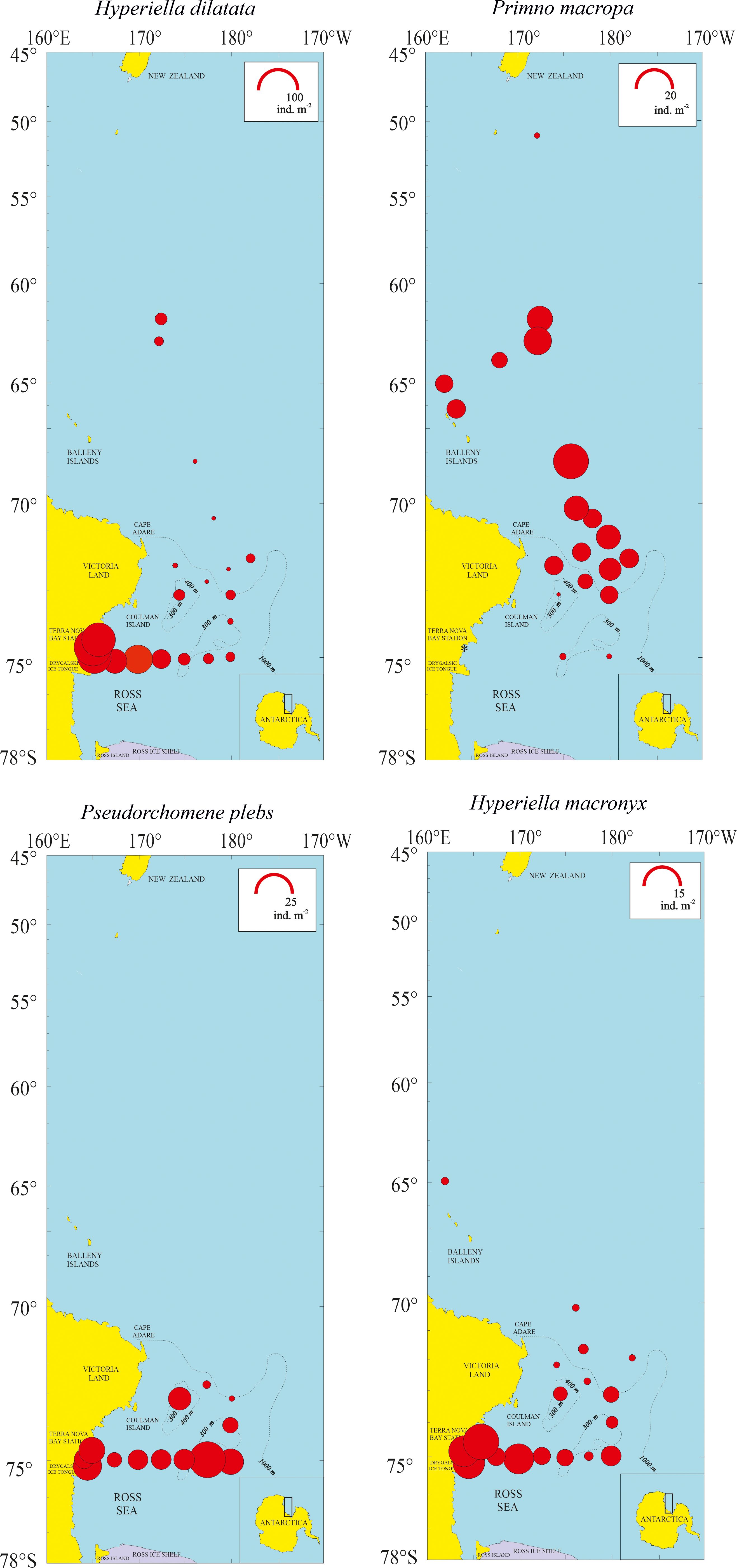 Figure 8. Density representation (ind m-2) of the four most abundant amphipod species (Hyperiella dilatata, Primno macropa, Pseudorchomene plebs, Hyperiella macronyx) in the 27 sampled stations.