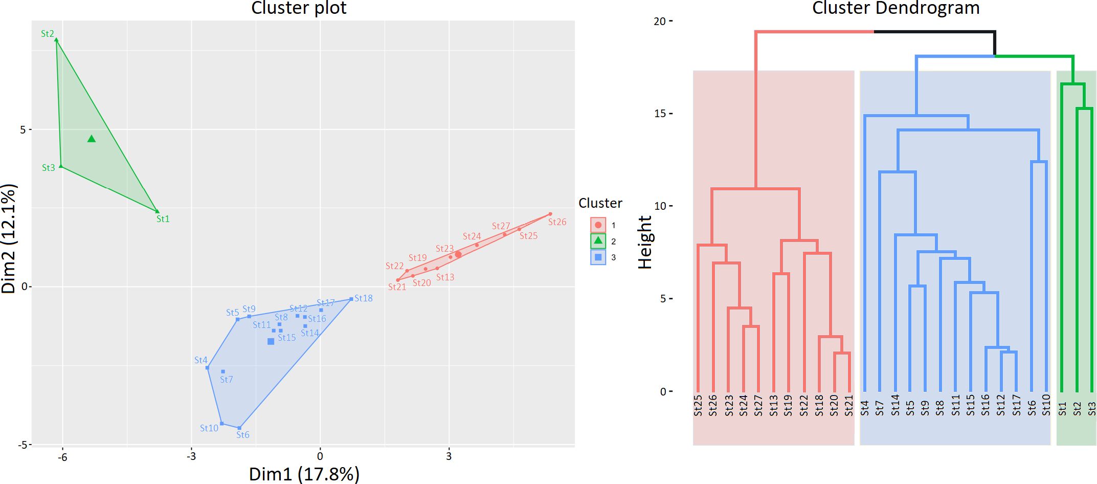 The factoextra package in R was used for carrying out the cluster analysis through k-means. Once the number of clusters was identified, the main species that were more abundant in the study area were analyzed and boxplots were generated to illustrate their abundance and distribution within the identified clusters.
