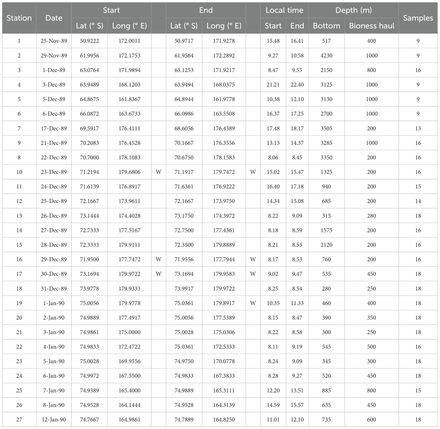 An interdisciplinary study of the Ross Sea ecosystem was undertaken during the Vth ItaliaAntartide Expedition on board the R/V Cariboo (Guglielmo et al., 1992). Between 25 November 1989 and 12 January 1990, 27 stations were sampled in the Pacific sector of the Southern Ocean, from New Zealand to the Western Ross Sea, across the Antarctic Convergence (Figure 2). Zooplankton was collected over several depth-layers, from the surface to near the seabed (Table 1), by BIONESS (Bedford Institute of Oceanography Net Environmental Sampling System), equipped with ten black nets of 500 μm mesh size (0.25 m2 mouth area; Sameoto et al., 1980). An altimeter PSA-900 (Benthos Inc.) provided information on the real-time distance to the bottom. At each sampling station, a multiparametric probe SBE 911plus (Sea-Bird Scientific, Bellevue, WA USA), which was mounted on the BIONESS frame, recorded vertical profiles of temperature (°C), salinity, and fluorescence (µg L−1 Chl a). The BIONESS was deployed at low speed along an oblique path to the maximum selected depth to be investigated, then towed at a speed of 1.5–2 m s-1 until closing, with the simultaneous opening of a new net. At almost all stations, two vertical profiles were undertaken, one from the maximum depth up to 100–200 m and the other over the depth of the euphotic layer. Depths for the euphotic layer samples were chosen according to the thermohaline structure and the fluorescence profiles. The depths of the sampled strata depended on the bottom depth (Table 1). Fishing upward, the nets were opened and closed on command, between 10–20 and 200 m intervals. Due to differences in depth at the sampling sites it was not always possible to collect the same number of samples. The volume of water filtered for each layer varied between 43 and 372 m3, according to the thickness of the sampled layer. A total of 410 samples was collected, with a total volume of 32684 m3 of water filtered. The zooplankton samples collected at each station from the surface to the maximum sampled depth, during the downward deployment of the BIONESS, were not used for this work but observed in the laboratory for the detection of rare species. On board, all the zooplankton samples were preserved in a 4% buffered formaldehyde-seawater solution.