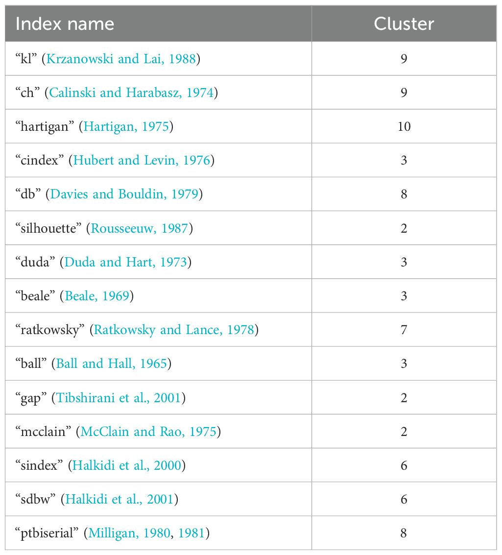 Table 2. Indexes used to evaluate the clusters number (Charrad et al., 2014), with the number of cluster obtained.