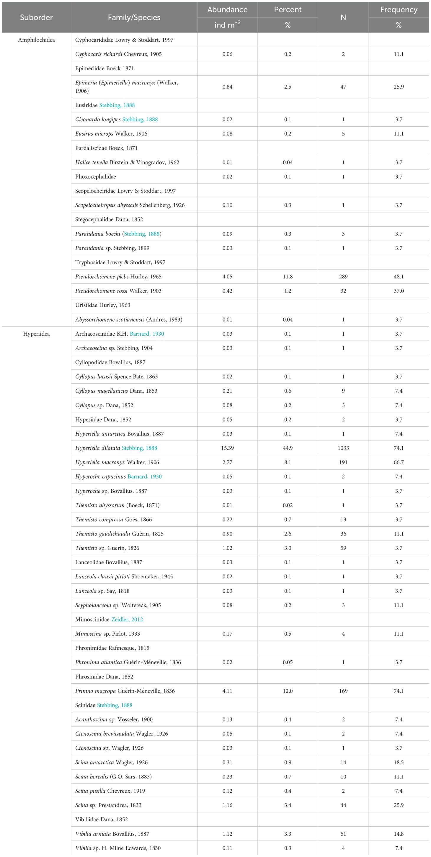 Hyperiella dilatata and P. macropa were distributed widely (20 out of 27 sampling stations), with a percentage frequency of occurrence (PFO) of 74% (Table 3). Hyperiella macronyx (PFO = 67%) was detected at 18 sampling stations. Pseudorchomene plebs was present at 48% of the stations, followed by P. rossi (37%, 10 stations), E. (Epimeriella) macronyx and Scina sp. (7 stations), Scina antarctica (5 stations) and V. armata (4 stations). All the other identified 25 species or taxa were detected occasionally, being present at one to three stations.