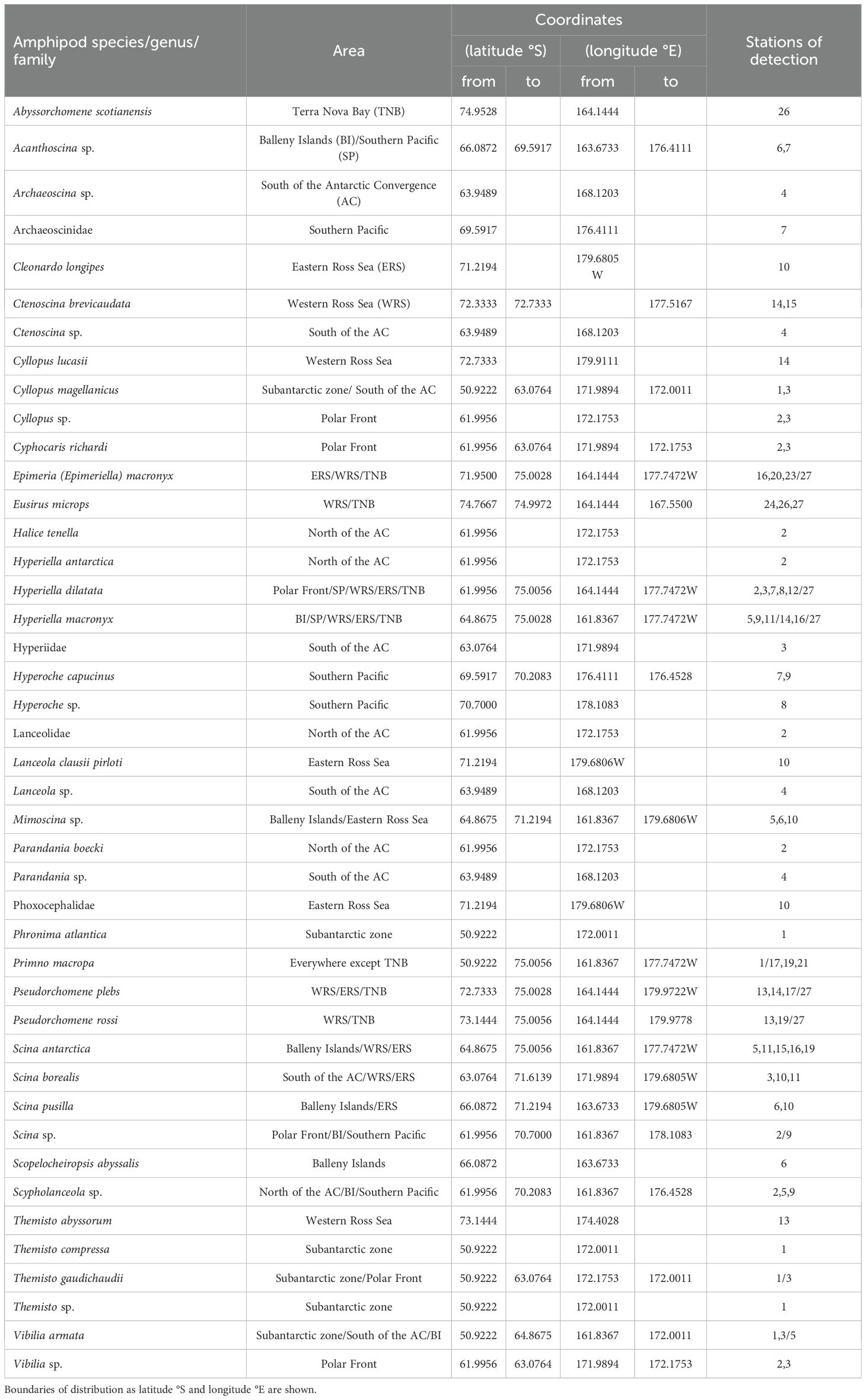 The spatial distribution boundaries of the amphipod taxa collected during this study, are shown in Table 4. Only two species (Phronima atlantica and Themisto compressa) and one genus (Themisto sp.) were found exclusively in the Sub-Antarctic zone (station 1) at latitude 50.9222°S, while three species (Halice tenella, Hyperiella antarctica and Parandania boecki) and one family (Lanceolidae) were found only in the area north of the Polar Front (station 2, 61.9956°S). Cyllopus magellanus and T. gaudichaudii were recovered only between the Sub-Antarctic zone and Polar Front (stations 1 and 3), while Cyphocaris richardi and two genera (Cyllopus sp. and Vibilia sp.) were present only in the Polar Front (stations 2 and 3), between 61.9956 and 63.0764°S. Four genera (Archaeoscina sp., Ctenoscina sp., Lanceola sp. and Parandania sp.) were found in the area south of the Polar Front (station 4, 63.9489°S). One species (Scopelocheiropsis abyssalis), one genus (Acantoscina sp.) and one family (Archaeoscinidae) were found in the ice-covered stations 6 and/or 7. Hyperiella dilatata and H. macronyx were present throughout all the study area, including Terra Nova Bay, with a small difference in the northern limit of their detection: the Polar Front (61.9956°S) and the Balleny Islands (64.8675°S), respectively. Primno macropa was collected over a large area, from the Sub-Antarctic Front to the mid Ross Sea Region (at station 21). Some species were found only along the two transects at the northern entrance of the Ross Sea: Cleonardo longipes, Lanceola clausii pirloti and the family Phoxocephalidae were found exclusively in station 10 (71.2194°S), while Ctenoscina brevicaudata, Cyllopus lucasii and Temisto abyssorum were recorded at stations 13,14,15. Eusirus microps and Abyssorchomene scotianensis are exclusive species of Terra Nova Bay (about 75°S).