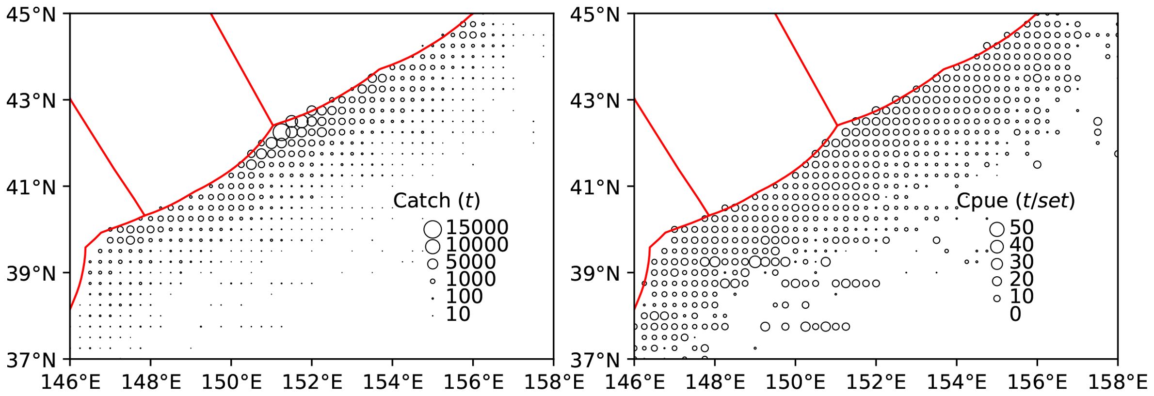 Fishery catch data were aggregated into grid cells of 0.25°×0.25° in Cartesian (latitude-longitude) coordinates and 0.1R×0.1R in the normalized eddy-centric coordinate system (R denotes eddy radius). The CPUE at each grid point was calculated using the formula: , where N represents the number of fishing efforts within the grid, and denotes the catch yield recorded for the i-th operation. Within the study region (140°E–170°E, 30°N–50°N), longitude and latitude coordinates were randomly generated, equal in number to the fisheries catch data records. The actual geographical coordinates in the catch dataset were replaced with randomly generated latitude and longitude values to produce a randomized catch dataset for comparative analysis.