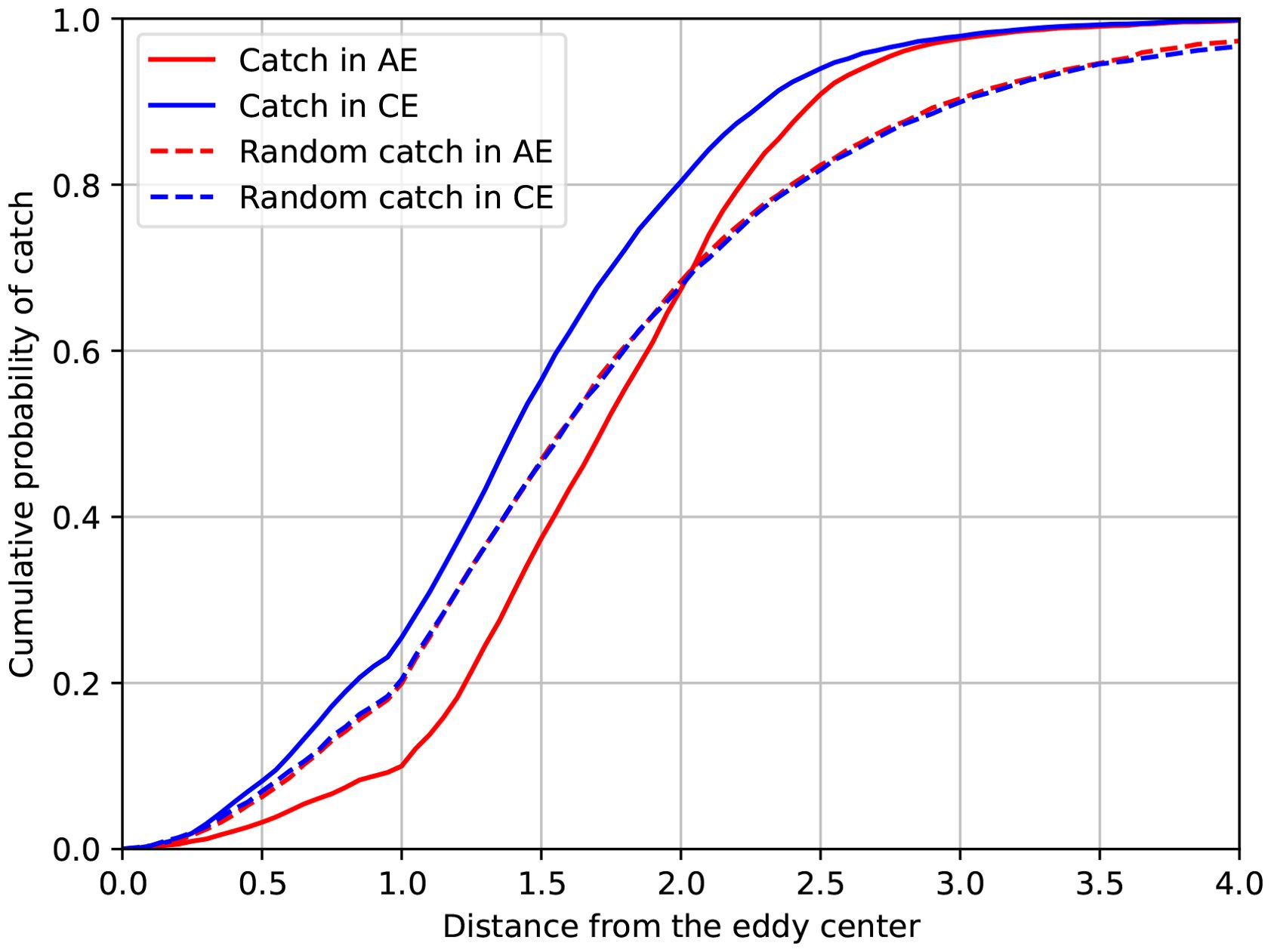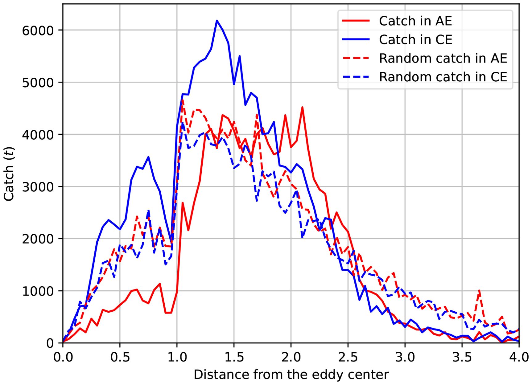 Projecting both randomized and actual chub mackerel catch data onto standardized eddy-centric coordinate systems for anticyclonic and cyclonic eddies reveals significant distributional divergences between the two regimes. The random catch yields are predominantly distributed within the 2R from eddy centers, indicating that spatial grid points projected onto the eddy-centric coordinate system mainly fall within this area. Furthermore, the distribution of random yields exhibits greater dispersion and uniformity in both cyclonic and anticyclonic eddies. If the influence of eddies on yield distribution is disregarded, the spatial characteristics of yields in anticyclonic and cyclonic eddy environments would exhibit similar distribution patterns. Actual catch yields are predominantly concentrated in the northwest quadrant between R and 2.5R from anticyclonic eddy centers, while distributed within the 2R of cyclonic eddies with higher density in the southeastern sector and relatively sparse in the northwestern sector. Statistical analysis of Moran’s I index confirmed the spatial heterogeneity of these distribution patterns is statistically significant. Quantitative assessments revealed 57.8% of total yields occurred near cyclonic eddies versus 42.2% near anticyclonic eddies, contrasting with their respective random distribution proportions of 51.5% and 48.5%. Kolmogorov-Smirnov tests demonstrated significant differences (p<0.01) in yield distribution patterns along the radial gradients of cyclonic versus anticyclonic eddies. These findings collectively demonstrate that fishing grounds are predominantly displaced from anticyclonic eddies, with primary aggregation along their northwestern outer margins, while exhibiting closer proximity to cyclonic eddies where distributions are concentrated in southeastern sectors. This is consistent with the 2021 – 2023 June-August offshore comprehensive survey showing that marine organisms in the Kuroshio-Oyashio confluence zone are mainly distributed in the northern areas of anticyclonic eddies and southern areas of cyclonic eddies (Su et al., 2025). Studies indicate that Japanese flying squid (Todarodes pacificus) are more abundant in anticyclonic eddies during years of the Kuroshio Current’s large meander (LM) path (Zhang et al., 2022), which may be attributed to the increased generation of anticyclonic eddies in the northern Kuroshio Extension region during LM years (Zhang et al., 2025). The warm water and highly oxygenated water within anticyclonic eddies allow large pelagic fish such as tuna and sharks to forage in deeper zones and prolong their residence time within these eddies (Braun et al., 2019; Durán Gómez et al., 2020; Lindo-Atichati et al., 2012). These findings demonstrate varying dependencies of different fish species on environmental factors. In contrast, this study reveals that chub mackerel tend to aggregate near cyclonic eddies while avoiding anticyclonic eddies, exhibiting a distinct spatial preference compared to large tuna species predominantly found in anticyclonic eddies.
