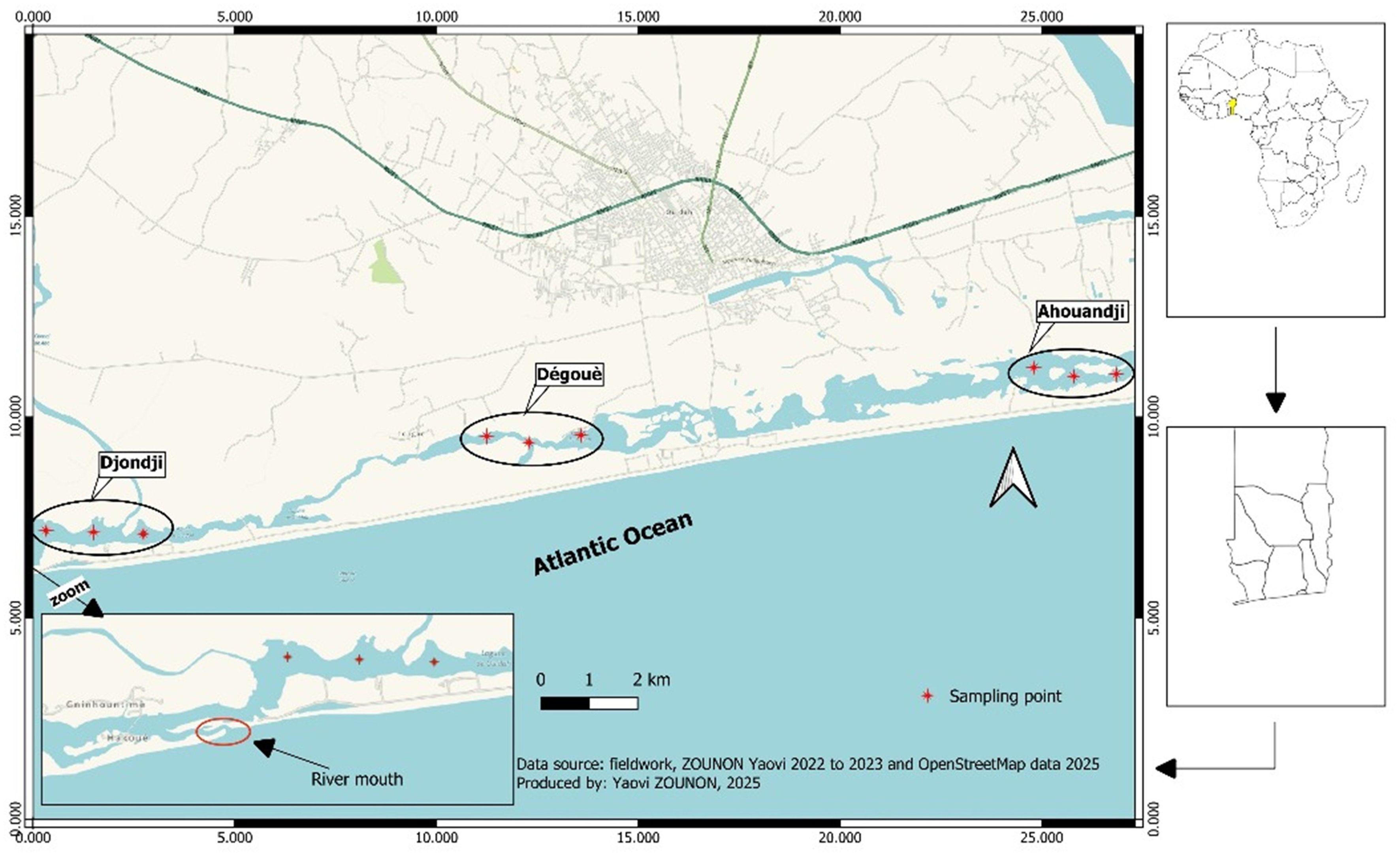 This study was conducted in the coastal lagoon of Benin. The lagoon is located between meridians 1°48′ and 2°16′ East, and parallels 6°16′ and 6°20′ North and covers an area of 55 km². It stretches almost parallel to the Atlantic Ocean for approximately 60 km, from Grand-Popo to Togbin. The Grand-Popo coastal lagoon receives water from the Mono River and Lake Ahémé, and discharges into the sea through the “BOUCHE DU ROY” outlet near the village of Avlo-Plage, and more recently through Djondji mouth (Viaho, 2014).