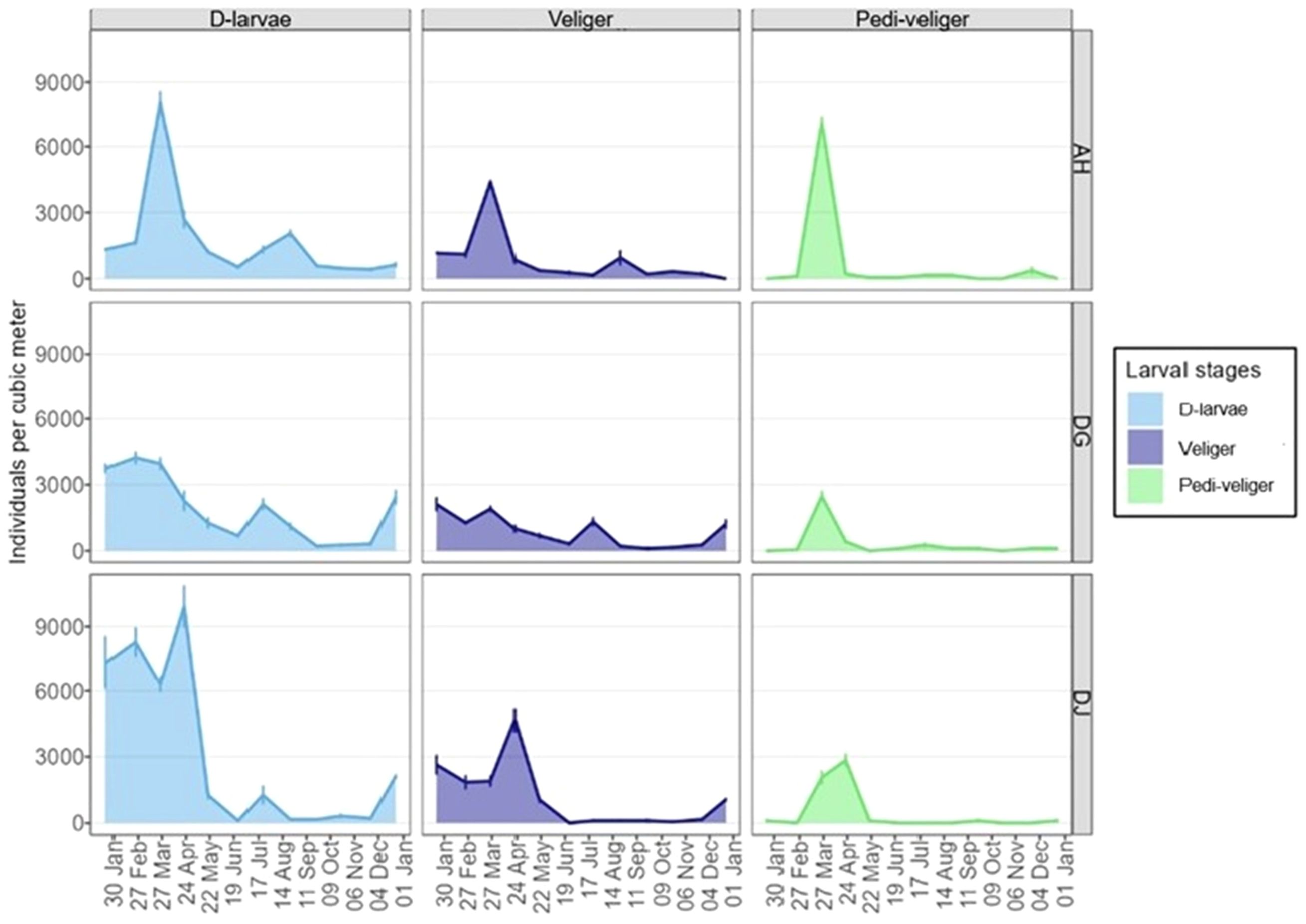 As for pedi-veliger larvae, a similar pattern was observed, with a peak in March (2480.0 ind/m³). For the rest of the year, their density remained relatively low.