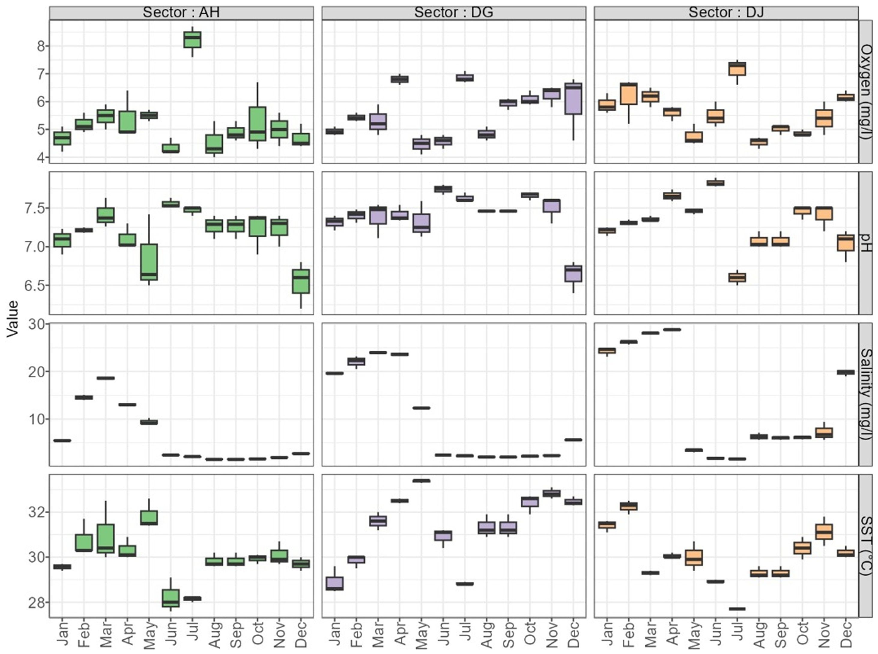 Environmental factors strongly influence the reproduction and development of oysters of (Hawkins et al. 2013; Paixao et al. 2013; Mahu et al., 2022). In this study, salinity (ppt), temperature (°C), pH, dissolved oxygen (mg/L), and water transparency (cm) were measured in situ at sampling stations during each field campaign. For each sampling event, these parameters were measured once at each station using a multi-parameter probe (Aquaread AP-700 & AP-800), and transparency was assessed with a Secchi disk.