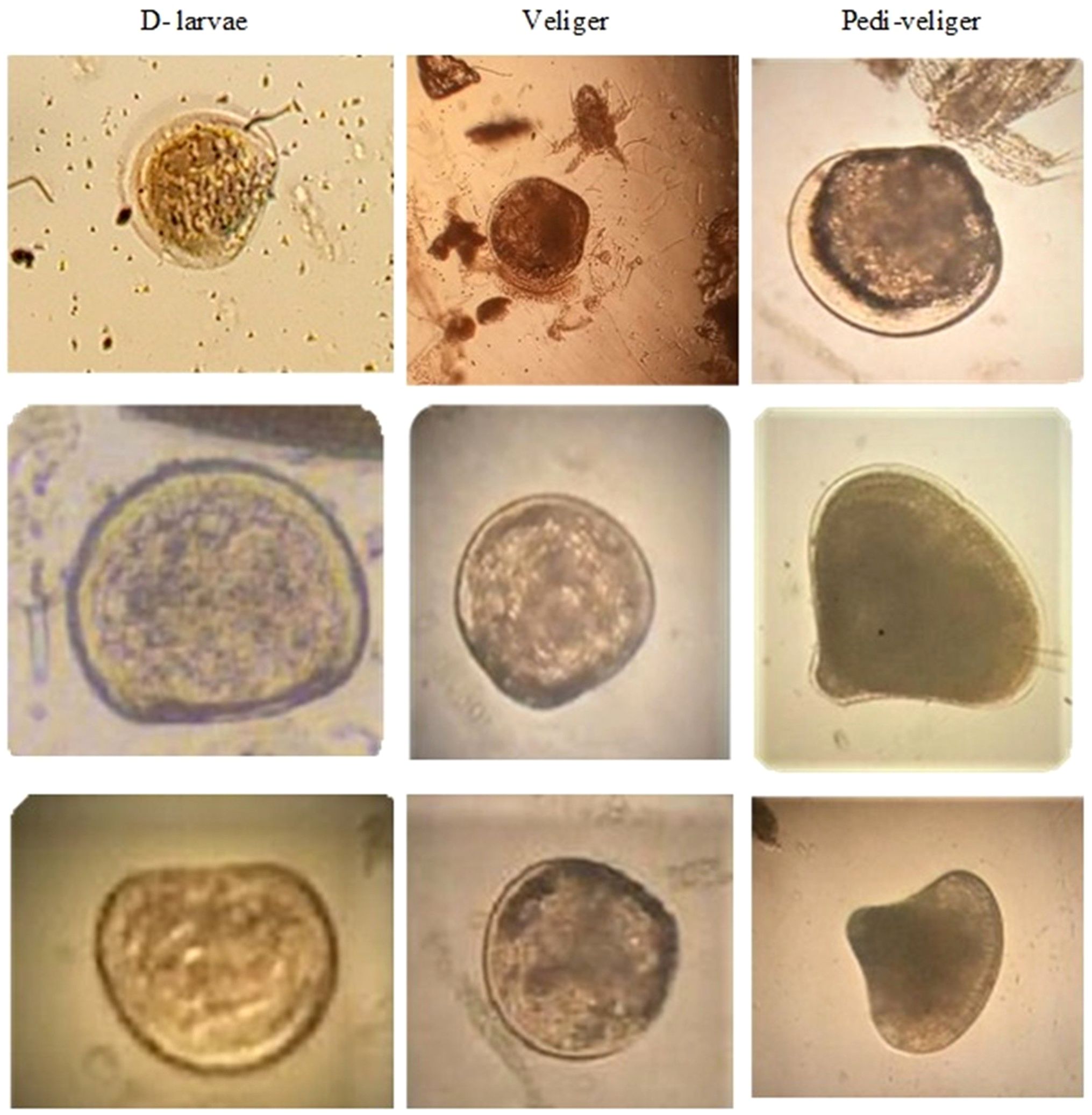 A total median value of 2251 ± 25 D- larvae was recorded in the coastal lagoon waters during this study. The highest median value of D- larvae was observed in the Dégouè production area (1425 ± 43 larvae), followed by the Ahouandji production area (1190 ± 59 larvae). The lowest median value of D- larvae was found in the Djondji production area (1105 ± 106 larvae). For veliger larvae, a total median value of 951 ± 11 larvae was recorded in the lagoon waters. The highest median value (710 ± 21 larvae) was found in the lagoon waters of the Dégouè production area. It was followed by the Djondji production area (475 ± 42 larvae). The lowest median value of veliger larvae was found in the Ahouandji production area (320 ± 33 larvae). For pedi-veliger larvae, a total median value of 481 ± 12 larvae was recorded in the lagoon waters. In the three production areas, the median value for pedi-veliger larvae in the coastal lagoon waters was zero.