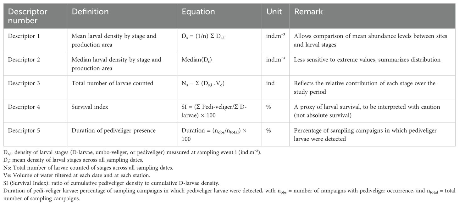 Four abundance-related Descriptors were calculated for each larval stage: the mean, median, maximum, and the total number of larvae (the product of density and filtered volume at each date and station), all expressed in individuals per cubic meter (ind.m⁻³), except for the last one (the total number of larvae), which is expressed as ind. These values provide an overview of larval presence and density throughout the sampling period.