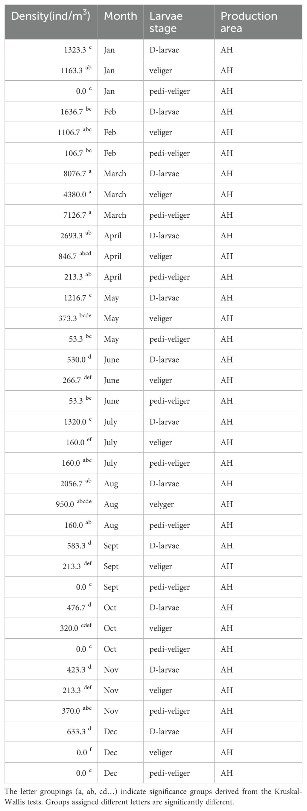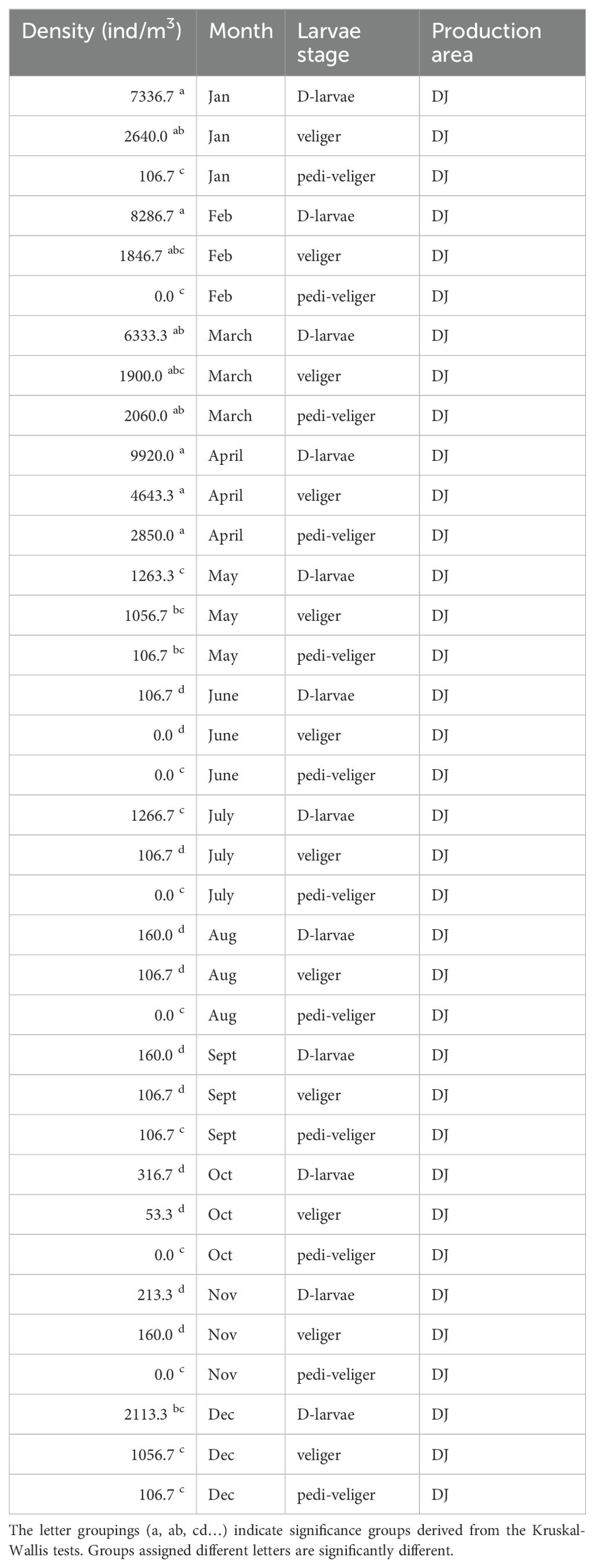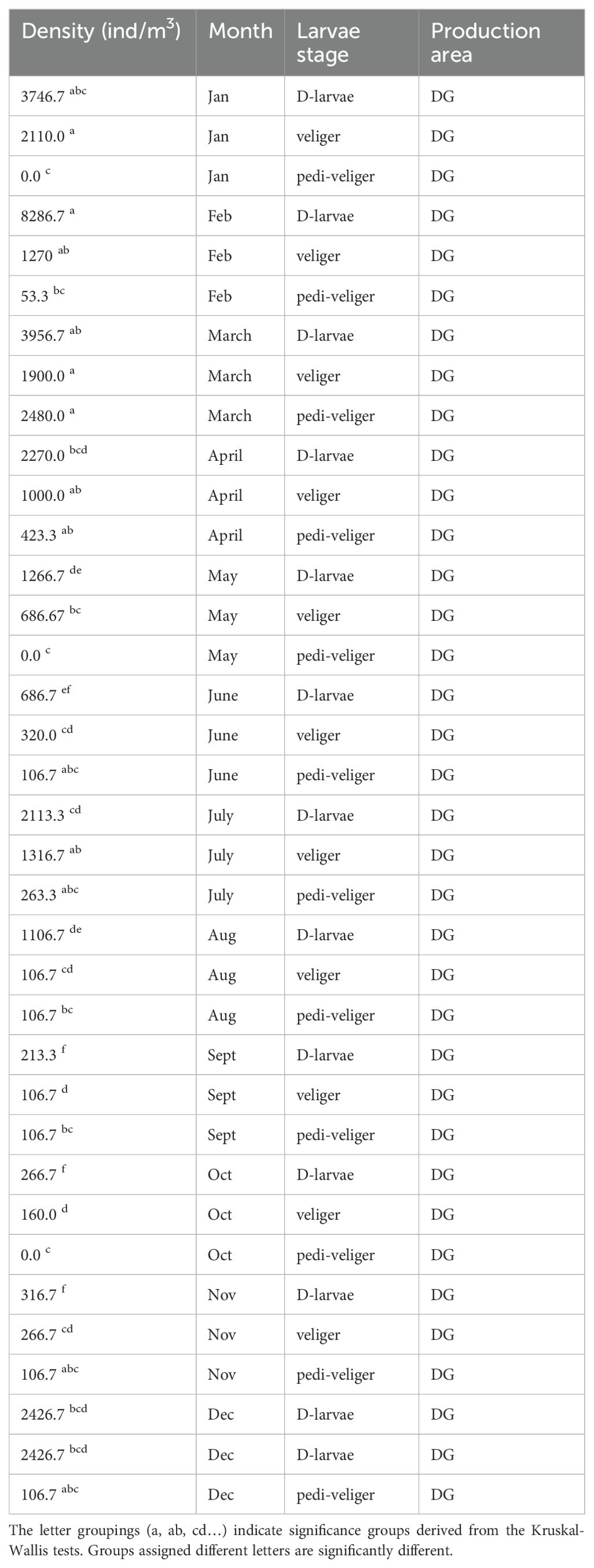 A similar trend was observed for veliger larvae in this production area, which saw an increase in density starting in December, with abundance peaks in January (2110.0 ind/m³) and March (1900.0 ind/m³). Their density then decreased from April onwards, before rising again with a peak in July (1316.7 ind/m³), although still lower in amplitude than those observed in January and March. The months with the lowest larval abundance were August, September, and October (106.7 ind/m³/month).