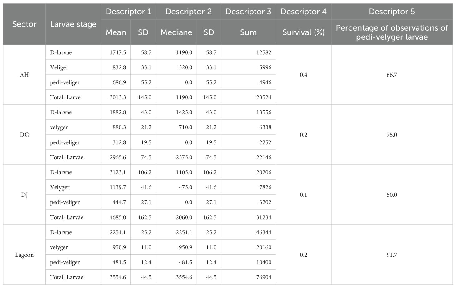 Descriptor 3 (Table 5) provides information on the total number of larvae counted by larval stage in the coastal lagoon waters across the different production areas of the oyster C. tulipa. In the Ahouandji production area, a total of 23,524 larvae were counted, including 12,582 D- larvae, 5996 veliger larvae, and 4946 Pedi-veliger larvae during the study period. In the Dégouè production area, a total of 22,146 larvae were recorded, including 13,556 D-, 6338 veliger, and 2252 Pedi-veliger larvae. In the Djondji production area, a total of 31,234 larvae were counted, comprising 20,206 D-, 7826 veliger, and 3202 Pedi-veliger larvae. Considering the entire lagoon, a total of 76904 larvae were recorded, including 46,344 D-, 20,160veliger, and 10,400 Pedi-veliger larvae.