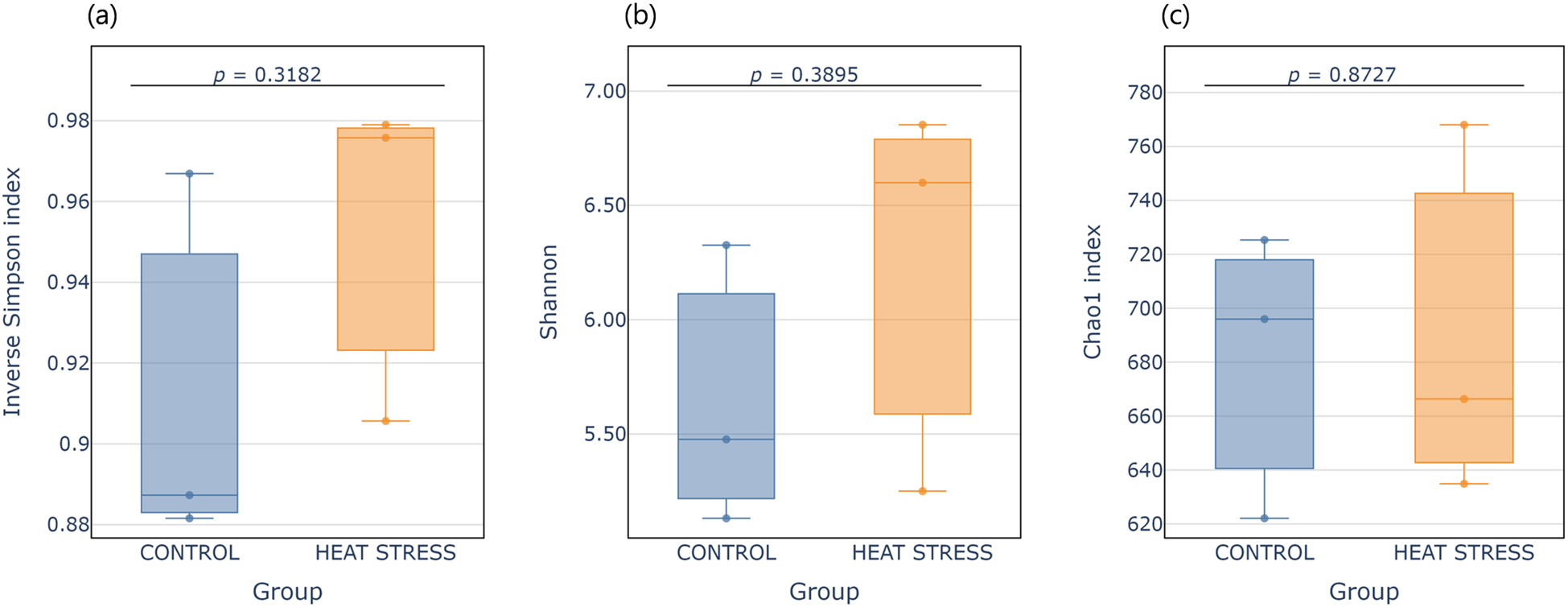 Boxplots showing alpha diversity indices for the control and heat treatment groups. (a) Inverse Simpson index, (b) Shannon index, and (c) Chao1 index. Each box represents the interquartile range (IQR), with the median shown as a horizontal line. Individual samples are overlaid as vertical jittered dots. p-values were calculated using Student’s t-test.