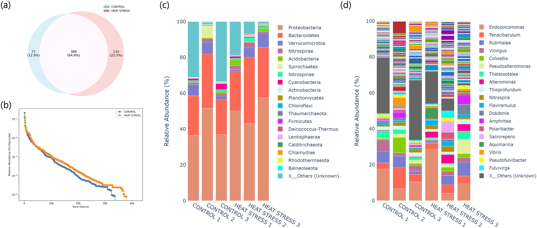 Taxonomic composition of microbial communities under control and heat stress conditions. (a) Venn diagram showing the number of shared and unique OTUs between the two groups at the species level. (b) Rank-abundance curves based on genus-level relative abundance (log scale). (c) Stacked barplot of relative abundance at the phylum level. (d) Stacked barplot of relative abundance at the genus level. “X_Others” indicates low-abundance or unclassified taxa grouped for clarity.