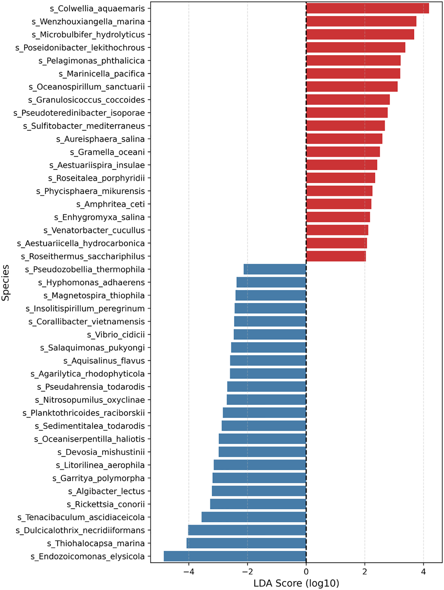 Given the high variation among samples, group-level comparisons based solely on average relative abundance can be misleading. To better quantify taxonomic shifts associated with heat stress, LEfSe (Linear Discriminant Analysis Effect Size) analysis was conducted (Figure 5; Supplementary Table S5). Using a threshold of LDA score > 2.0 and p < 0.05, a total of 43 species showed significant differences between the groups. The top five species enriched under heat stress were Colwellia aquamaris, Wenzhouxiangella marina, Microbulbifer hydrolyticus, Poseidonibacter lekithochrous, and Pelagimonas phthalicica. In contrast, species that were less abundant in the heat stress group included Endozoicomonas elysicola, Thiohalocapsa marina, and Dulcicalothrix necridiiformans, some of which are known for their photosynthetic capacity or benthic adaptations. For completeness, we also repeated the LEfSe analysis using a stricter LDA cut-off of 3.0. As a result, only 15 discriminatory species were retained, all of which are a subset of those shown in Figure 5. This result is provided in Supplementary Figure S2.