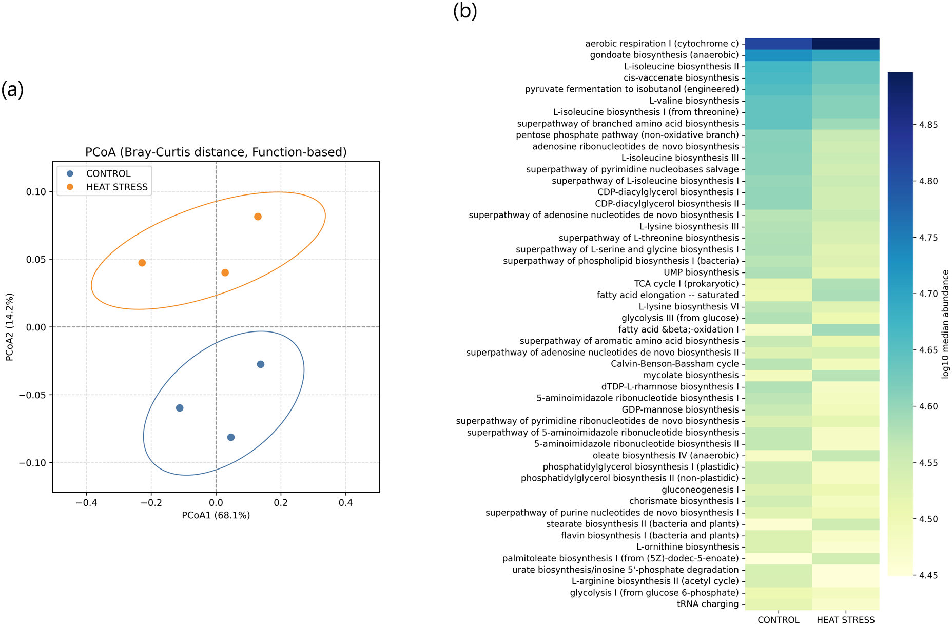 Functional analysis of microbial communities based on PICRUSt2-predicted MetaCyc pathways. (a) PCoA based on Bray–Curtis distances of functional profiles. Each point represents a sample, with ellipses indicating the 95% confidence intervals. (b) Heatmap displaying the log10-transformed median abundance of the top 50 predicted pathways in each group.