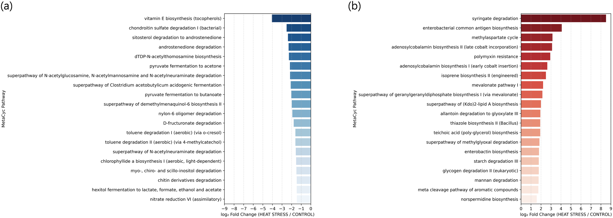 Top 20 predicted metabolic pathways showing the most significant changes in relative abundance between the heat stress and control groups based on log2 fold change of median values. (a) Pathways with decreased abundance in the heat stress group (log2FC < 0, blue). (b) Pathways with increased abundance in the heat stress group (log2FC > 0, red).