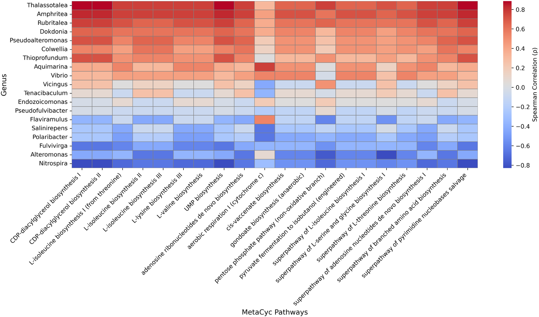 Spearman correlation heatmap between the top 19 genera and selected MetaCyc pathways. Each cell represents the Spearman correlation coefficient (p) between genus-level relative abundance and pathway abundance predicted by PICRUSt2. Red and blue colors indicate positive and negative correlations, respectively. Pathways and genera are ordered by mean correlation values to highlight overall patterns.
