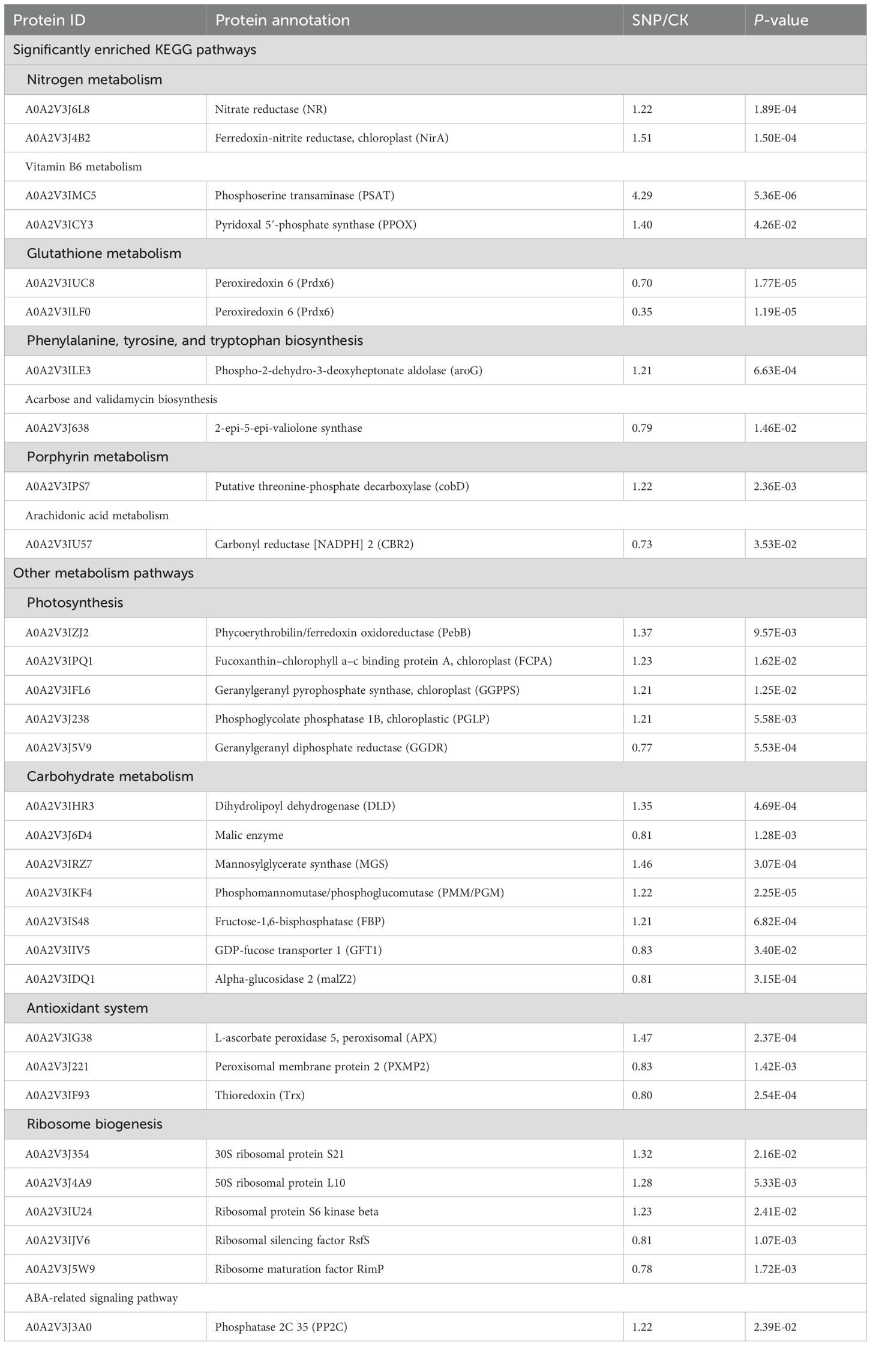 Unlike the previous upregulated enrichment pathways, glutathione metabolism was downregulated. Two peroxiredoxin 6 (Prdx6) proteins (EC:1.11.1.7, A0A2V3IUC8 and A0A2V3ILF0) in the glutathione metabolism pathway were downregulated to 0.70- and 0.35-fold in the SNP group compared to the CK group (Table 1), though Prdx6 is involved in countering oxidative stress (Rahaman et al., 2024).
