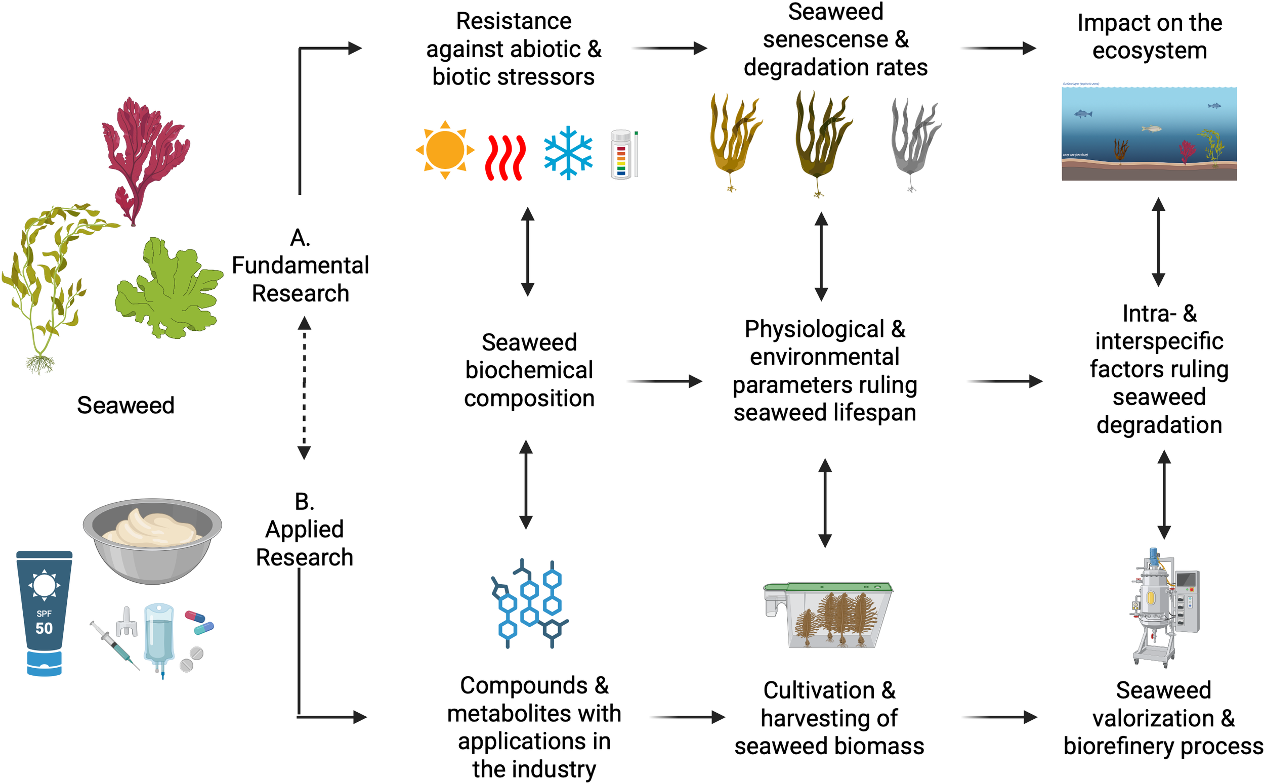 Fundamental (A) and applied (B) research are closely interconnected. First, understanding the biochemical composition of seaweeds is essential for characterizing taxa and for assessing how this composition influences the physiological and environmental factors that govern seaweed lifespan. These factors, in turn, shape the intra- and interspecific dynamics involved in seaweed degradation. Together, these three aspects provide a foundation for addressing key scientific questions from both fundamental and applied perspectives. The figure was created with Biorender. The following licences were obtained: Figure 1. Created in Biorender. Qui-Minet, (2025)https://BioRender.com/bblkl0q.