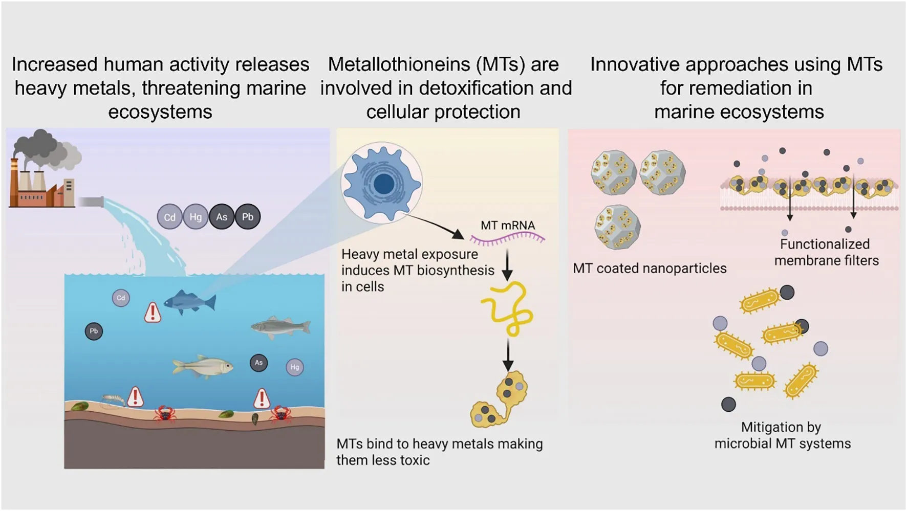 With the rise of anthropogenic activities worldwide, the load of heavy metal pollution in aquatic environments has surged, posing a serious threat to aquatic biodiversity and the ecological balance of coastal and marine waters. Heavy metal pollution not only endangers marine life but also impacts human health due to the bioaccumulation of heavy metals in seafood. As a result, there is an urgent need to understand the dynamics of heavy metal contamination in coastal ecosystems and to develop efficient strategies for their removal. MTs, present in aquatic vertebrates, invertebrates, and microbes, can bind heavy metals, making them valuable tools for assessing the responses of ecologically significant species to metal pollution and for designing mitigation strategies to prevent heavy metal pollution. However, a closer examination of metallothionein expression or activity in response to heavy metal exposure reveals a more complex relationship than previously understood. While many studies report altered metallothionein levels in various tissues following heavy metal exposure, the magnitude, and sometimes the direction, of this induction is influenced by external factors such as salinity, oxygen levels, and the immune status of the organisms. In some cases, there is no clear correlation between heavy metal exposure and metallothionein induction, suggesting that the response is more nuanced and context dependent. Nevertheless, the metal binding ability of the MTs can be harnessed to develop efficient mitigation strategies to subdue the heavy metal load in aquatic habitats.