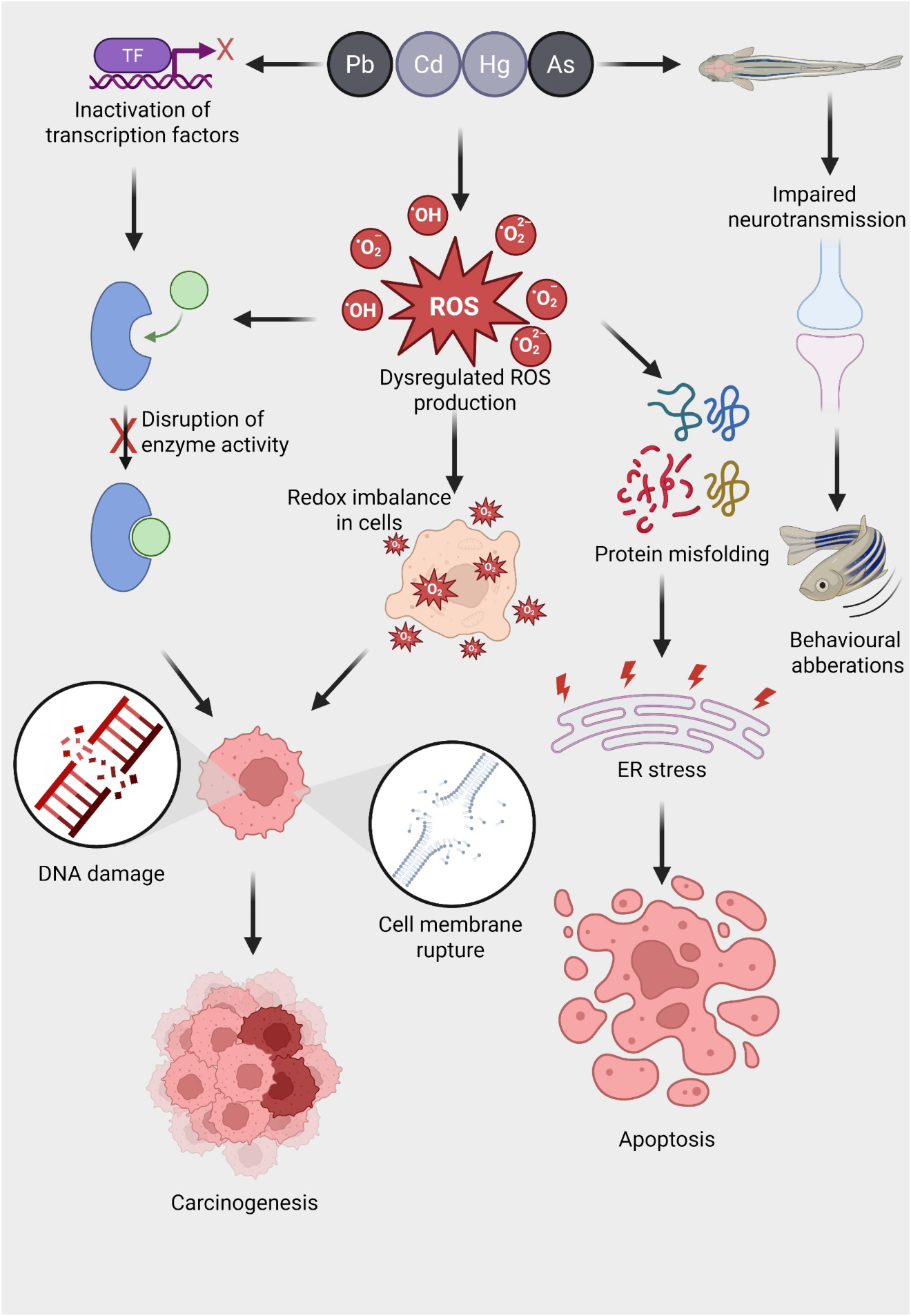 Mechanisms of heavy metal-induced oxidative stress and its downstream toxicological effects in aquatic organisms. Exposure to heavy metals such as lead (Pb), cadmium (Cd), mercury (Hg), and arsenic (As) triggers a cascade of toxicological responses in aquatic animals. These metals inactivate transcription factors (TFs), disrupt normal gene regulation, and interfere with enzyme function by binding to active sites or altering protein structure. A key consequence of metal exposure is the dysregulation of reactive oxygen species (ROS) production, including superoxide anions (O₂⁻), hydroxyl radicals (·OH), and hydrogen peroxide (H₂O₂), leading to a redox imbalance within cells. This oxidative stress results in widespread cellular damage, including (i) DNA strand breaks and mutations that can drive carcinogenesis, (ii) disruption of membrane integrity causing cell lysis, and (iii) protein misfolding that triggers endoplasmic reticulum (ER) stress. Persistent ER stress promotes apoptotic cell death. In neural tissues, heavy metal exposure impairs neurotransmission, potentially through ROS-mediated synaptic damage, resulting in behavioral aberrations such as altered locomotion and reduced responsiveness. Collectively, these molecular and cellular disruptions underlie the chronic toxicity and disease pathology associated with metal pollution in aquatic ecosystems.